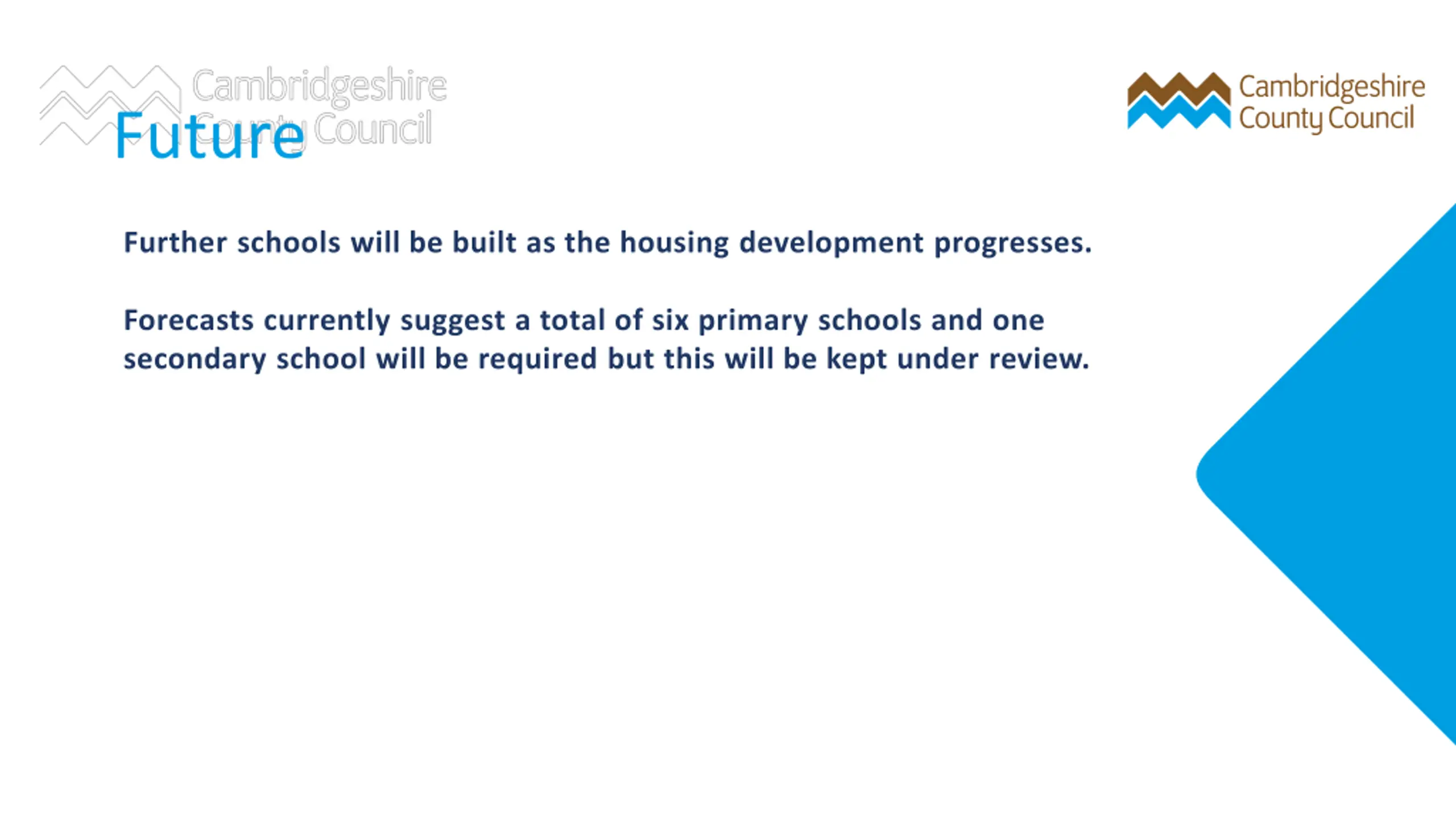 Future Further schools will be built as the housing development progresses. Forecasts currently suggest a total of six primary schools and one secondary school will be required but this will be kept under review.
