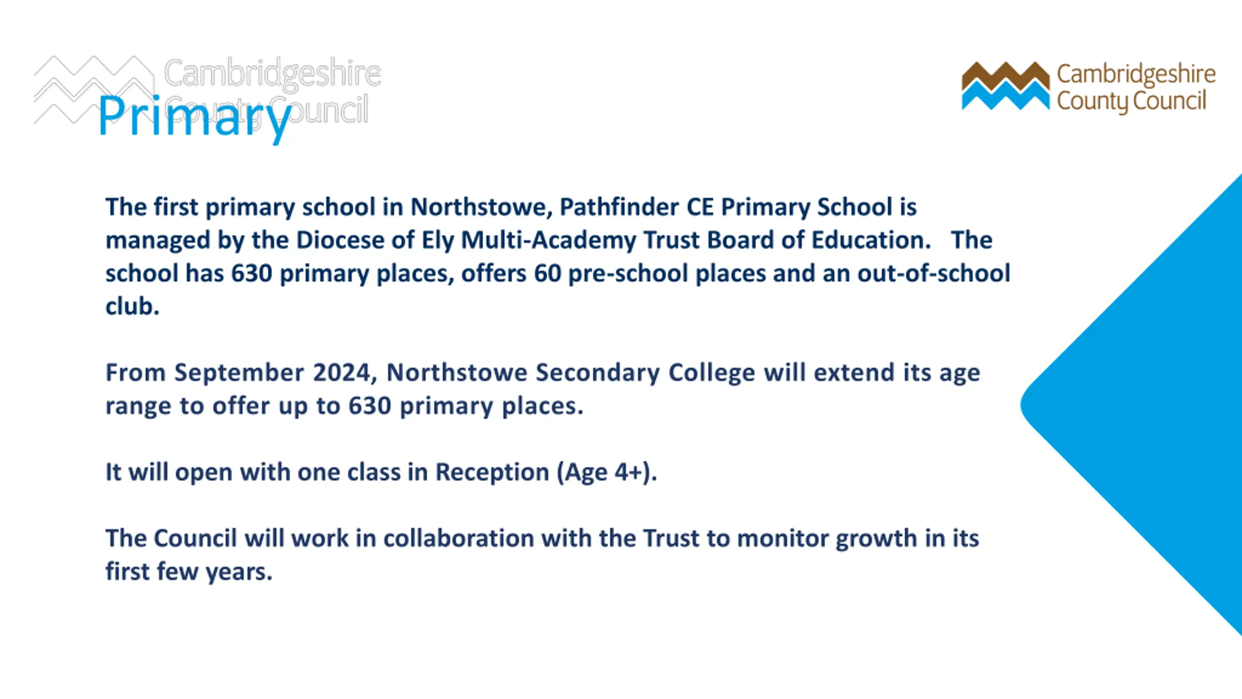 Primary The first primary school in Northstowe, Pathfinder CE Primary School is managed by the Diocese of Ely Multi-Academy Trust Board of Education. The school has 630 primary places, offers 60 pre-school places and an out-of-school club. From September 2024, Northstowe Secondary College will extend its age range to offer up to 630 primary places. It will open with one class in Reception (Age 4+). The Council will work in collaboration with the Trust to monitor growth in its first few years.