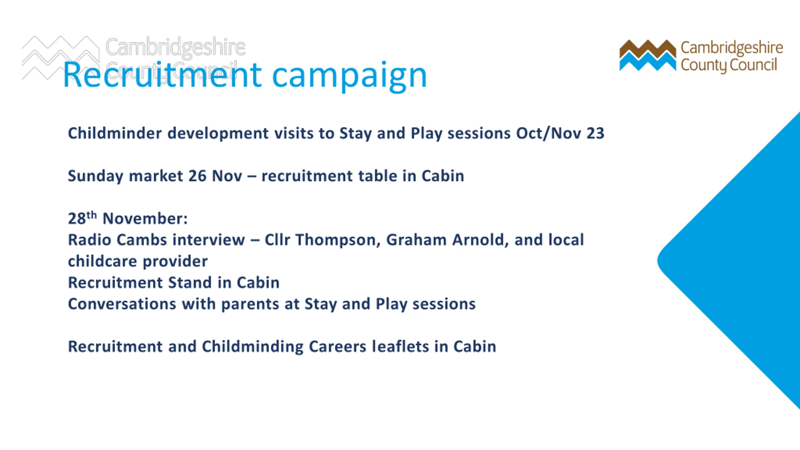 Recruitment campaign Childminder development visits to Stay and Play sessions Oct/Nov 23 Sunday market 26 Nov recruitment table in Cabin 28thNovember: Radio Cambs interview Cllr Thompson, Graham Arnold, and local childcare provider Recruitment Stand in Cabin Conversations with parents at Stay and Play sessions Recruitment and Childminding Careers leaflets in Cabin