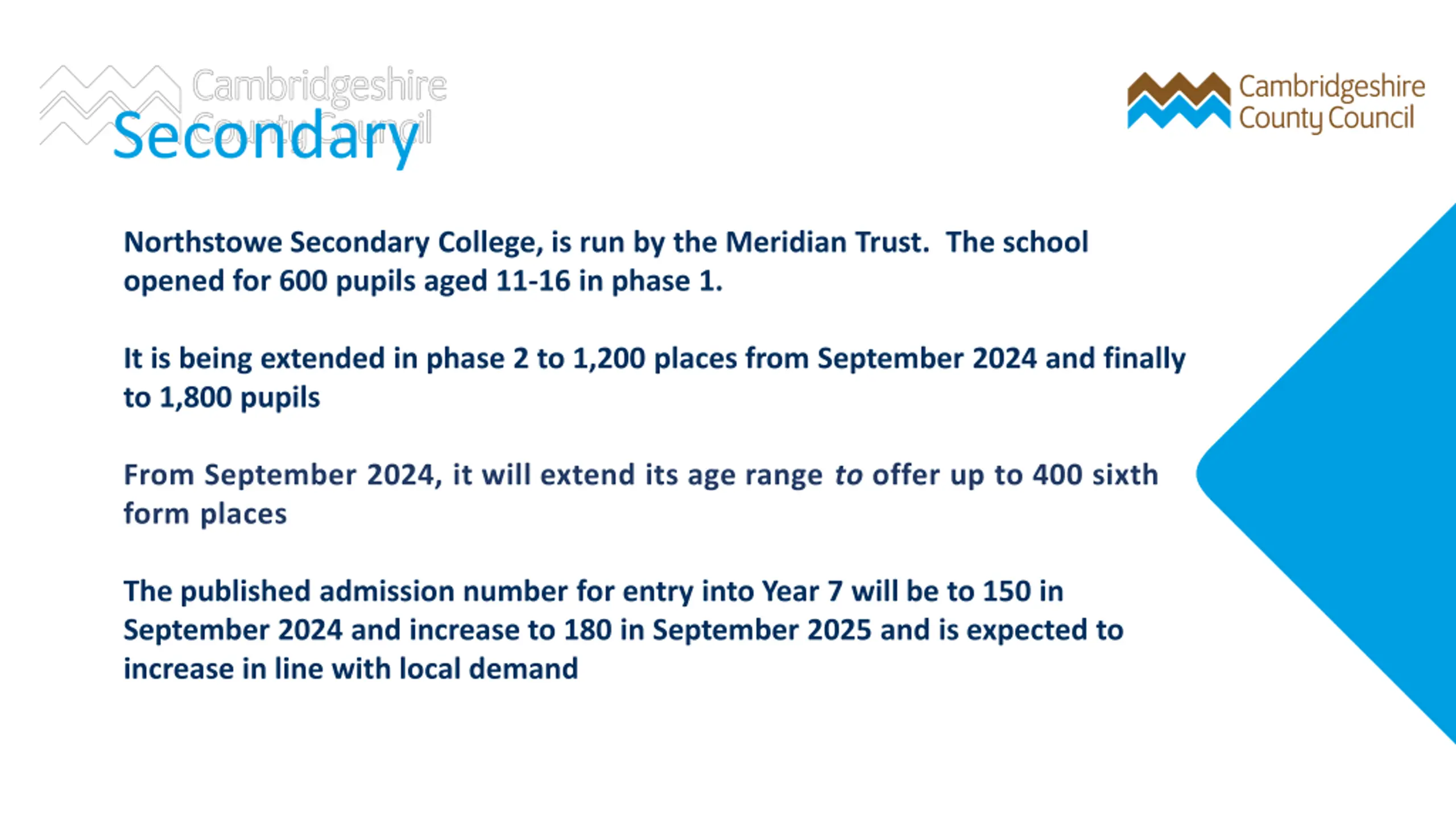 Secondary Northstowe Secondary College, is run by the Meridian Trust. The school opened for 600 pupils aged 11-16 in phase 1. It is being extended in phase 2 to 1,200 places from September 2024 and finally to 1,800 pupils From September 2024, it will extend its age range to offer up to 400 sixth form places The published admission number for entry into Year 7 will be to 150 in September 2024 and increase to 180 in September 2025 and is expected to increase in line with local demand