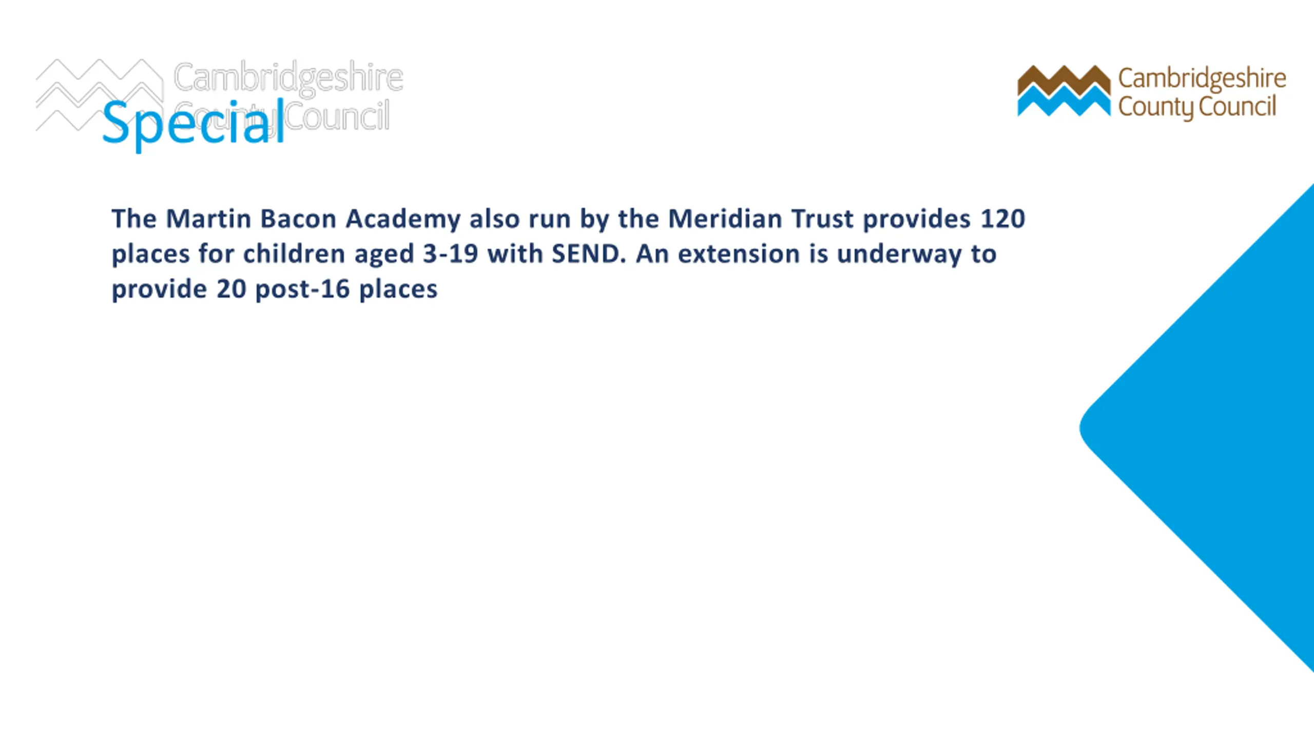 Special The Martin Bacon Academy also run by the Meridian Trust provides 120 places for children aged 3-19 with SEND. An extension is underway to provide 20 post-16 places