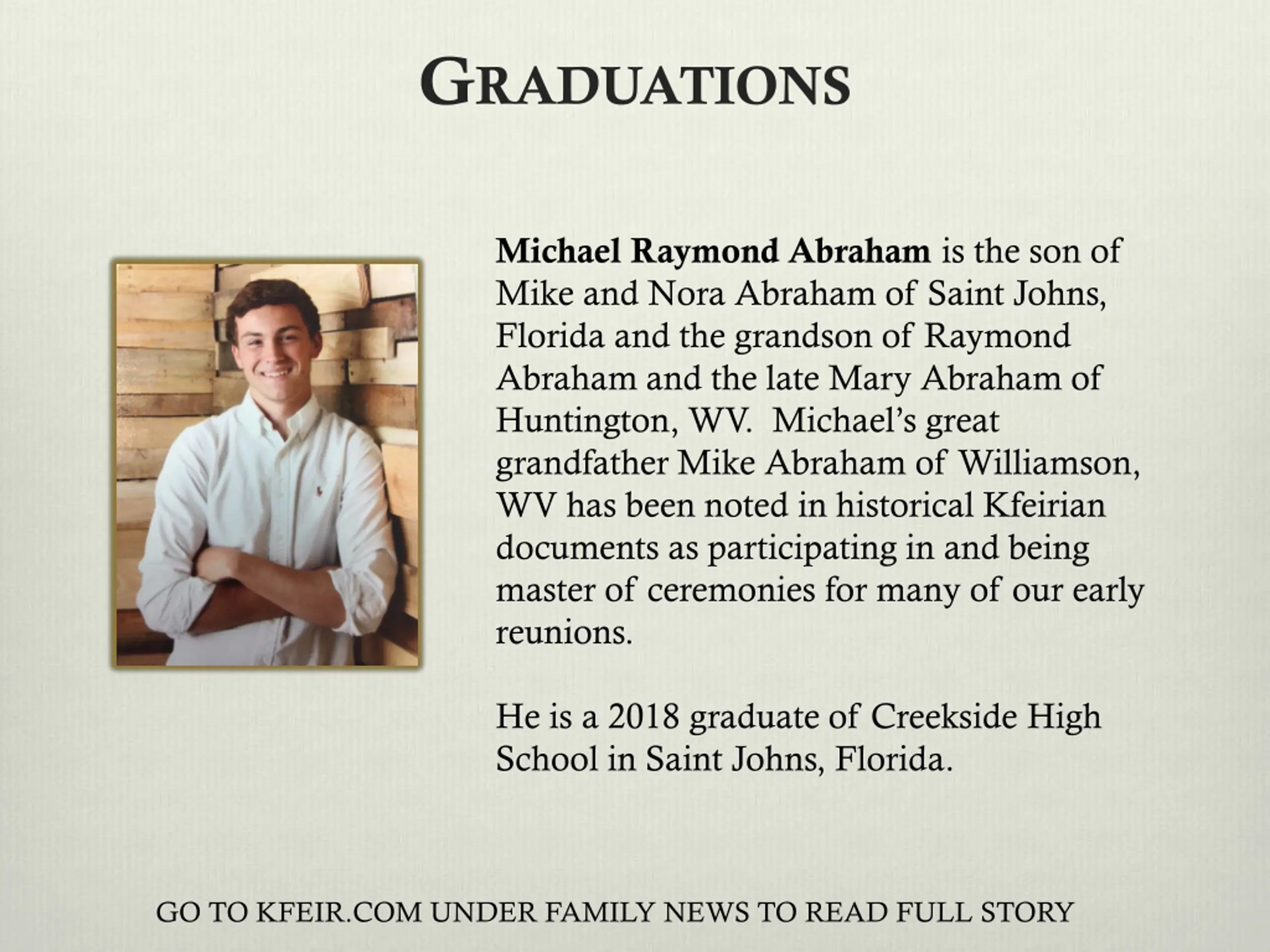 GRADUATIONS Michael Raymond Abraham is the son of Mike and Nora Abraham of Saint Johns, Florida and the grandson of Raymond Abraham and the late Mary Abraham of Huntington, WV. Michael s great grandfather Mike Abraham of Williamson, WV has been noted in historical Kfeirian documents as participating in and being master of ceremonies for many of our early reunions. He is a 2018 graduate of Creekside High School in Saint Johns, Florida. GO TO KFEIR.COM UNDER FAMILY NEWS TO READ FULL STORY