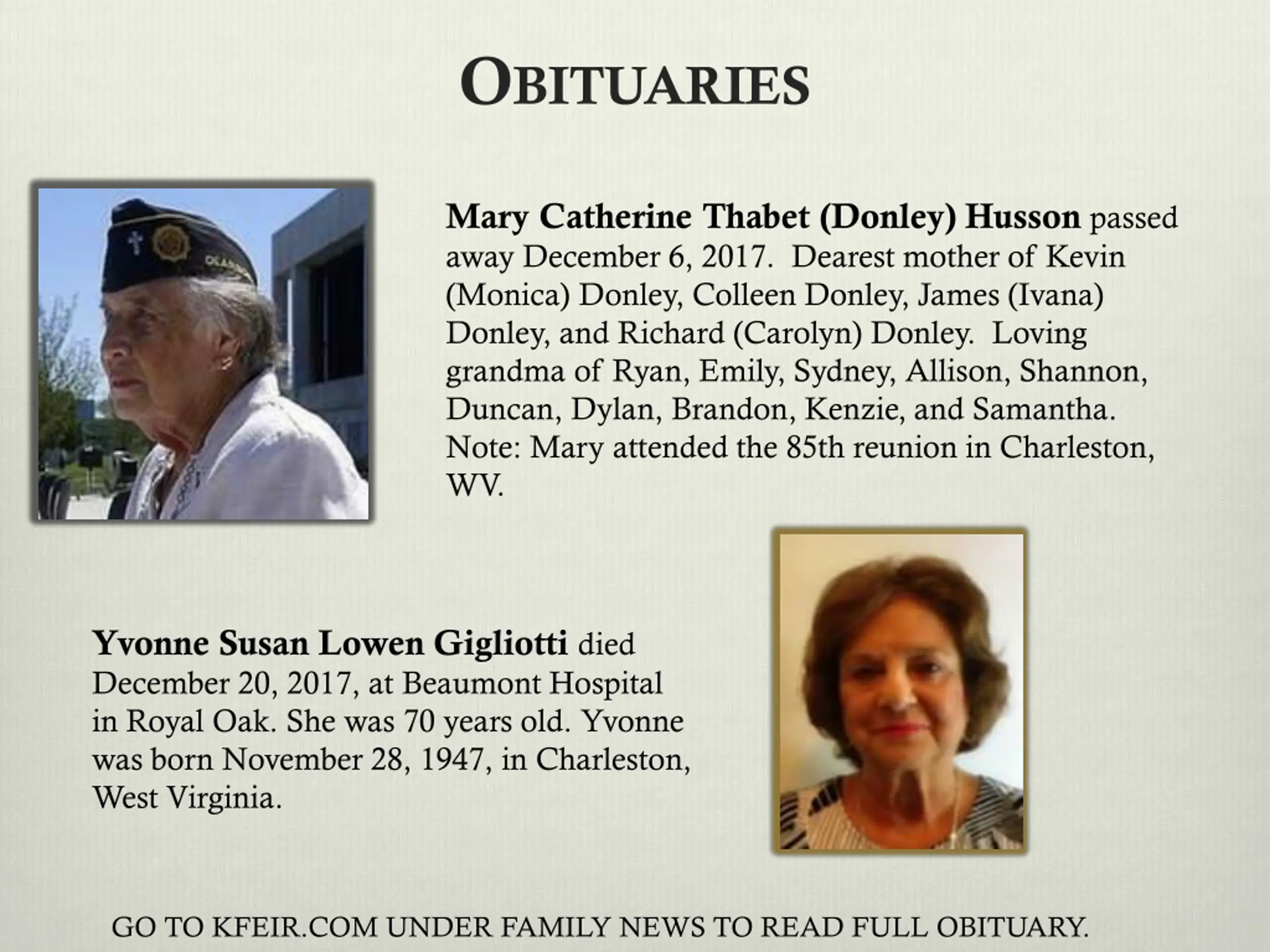 OBITUARIES Mary Catherine Thabet (Donley) Husson passed away December 6, 2017. Dearest mother of Kevin (Monica) Donley, Colleen Donley, James (Ivana) Donley, and Richard (Carolyn) Donley. Loving grandma of Ryan, Emily, Sydney, Allison, Shannon, Duncan, Dylan, Brandon, Kenzie, and Samantha. Note: Mary attended the 85th reunion in Charleston, WV. Yvonne Susan Lowen Gigliotti died December 20, 2017, at Beaumont Hospital in Royal Oak. She was 70 years old. Yvonne was born November 28, 1947, in Charleston, West Virginia. GO TO KFEIR.COM UNDER FAMILY NEWS TO READ FULL OBITUARY.