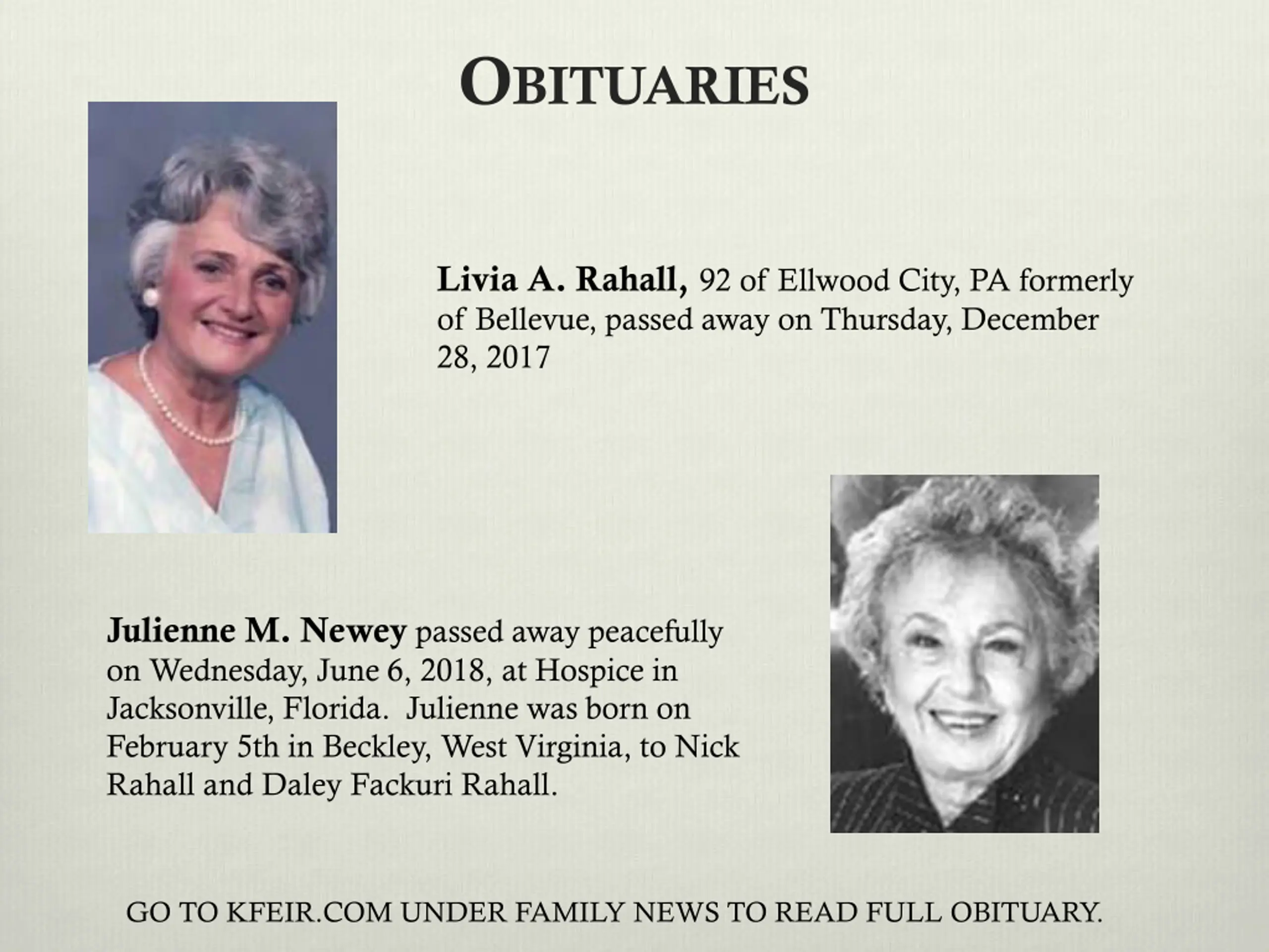 OBITUARIES Livia A. Rahall, 92 of Ellwood City, PA formerly of Bellevue, passed away on Thursday, December 28, 2017 Julienne M. Newey passed away peacefully on Wednesday, June 6, 2018, at Hospice in Jacksonville, Florida. Julienne was born on February 5th in Beckley, West Virginia, to Nick Rahall and Daley Fackuri Rahall. GO TO KFEIR.COM UNDER FAMILY NEWS TO READ FULL OBITUARY.