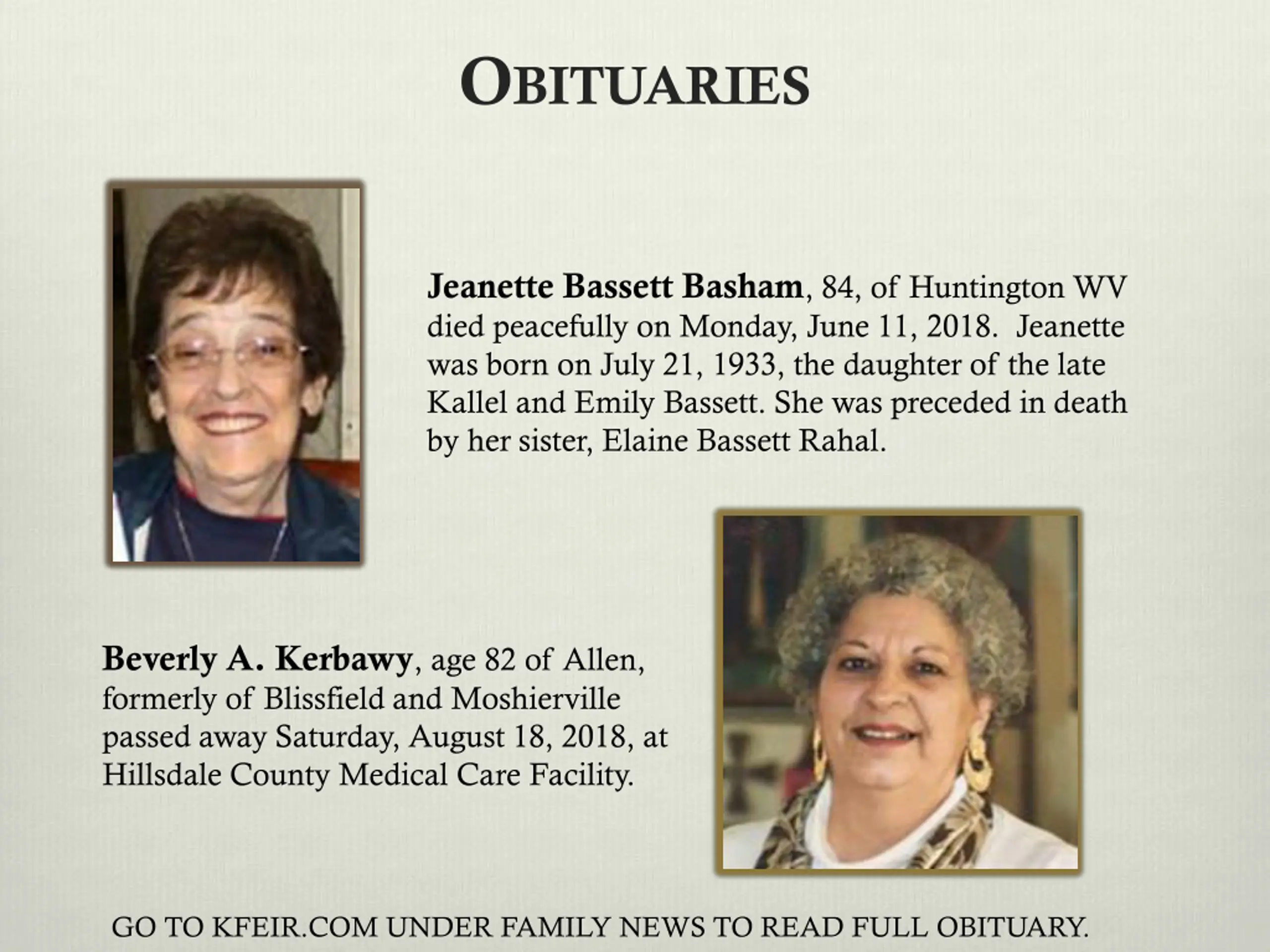 OBITUARIES Jeanette Bassett Basham, 84, of Huntington WV died peacefully on Monday, June 11, 2018. Jeanette was born on July 21, 1933, the daughter of the late Kallel and Emily Bassett. She was preceded in death by her sister, Elaine Bassett Rahal. Beverly A. Kerbawy, age 82 of Allen, formerly of Blissfield and Moshierville passed away Saturday, August 18, 2018, at Hillsdale County Medical Care Facility. GO TO KFEIR.COM UNDER FAMILY NEWS TO READ FULL OBITUARY.