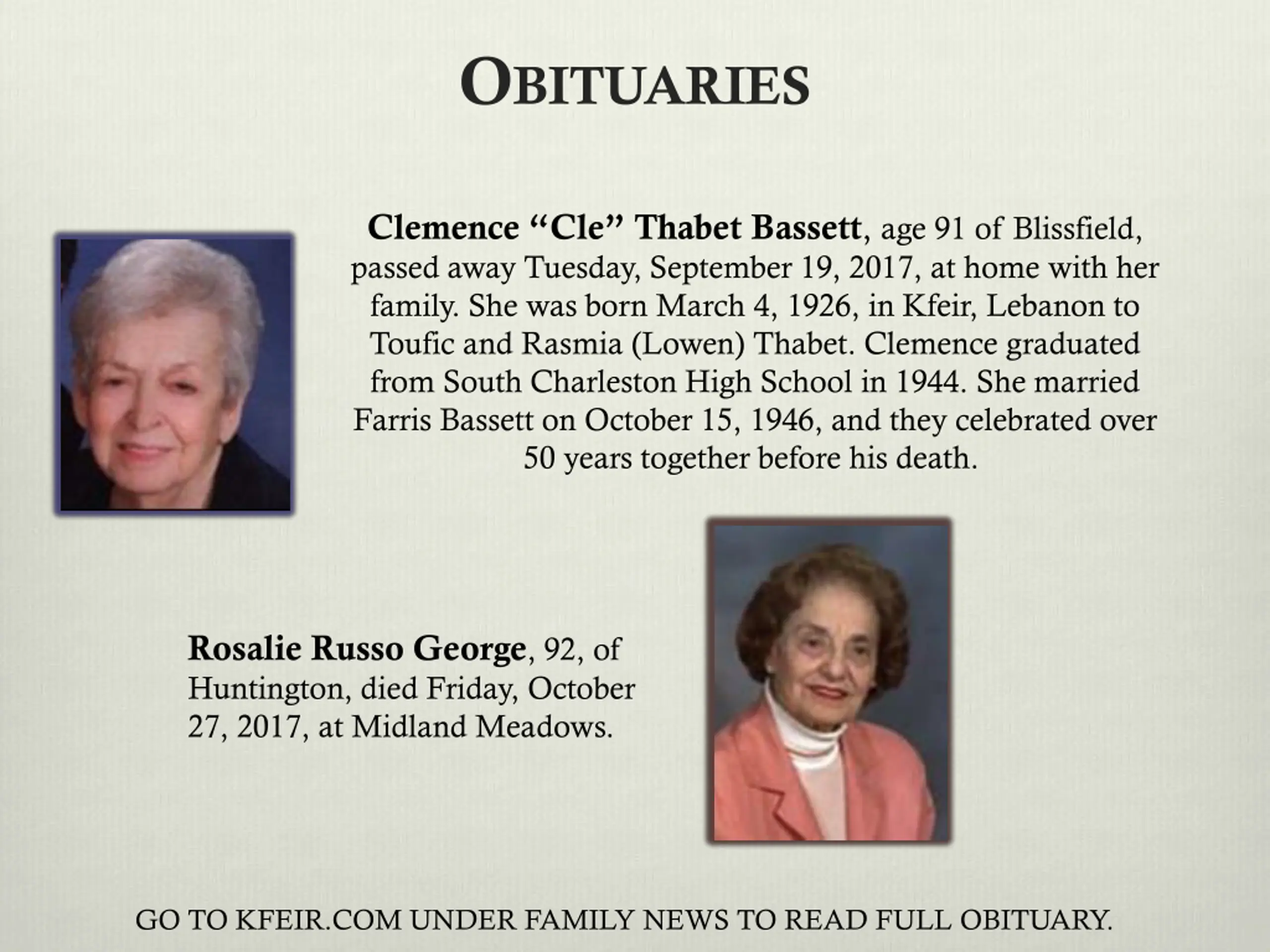OBITUARIES Clemence Cle Thabet Bassett, age 91 of Blissfield, passed away Tuesday, September 19, 2017, at home with her family. She was born March 4, 1926, in Kfeir, Lebanon to Toufic and Rasmia (Lowen) Thabet. Clemence graduated from South Charleston High School in 1944. She married Farris Bassett on October 15, 1946, and they celebrated over 50 years together before his death. Rosalie Russo George, 92, of Huntington, died Friday, October 27, 2017, at Midland Meadows. GO TO KFEIR.COM UNDER FAMILY NEWS TO READ FULL OBITUARY.