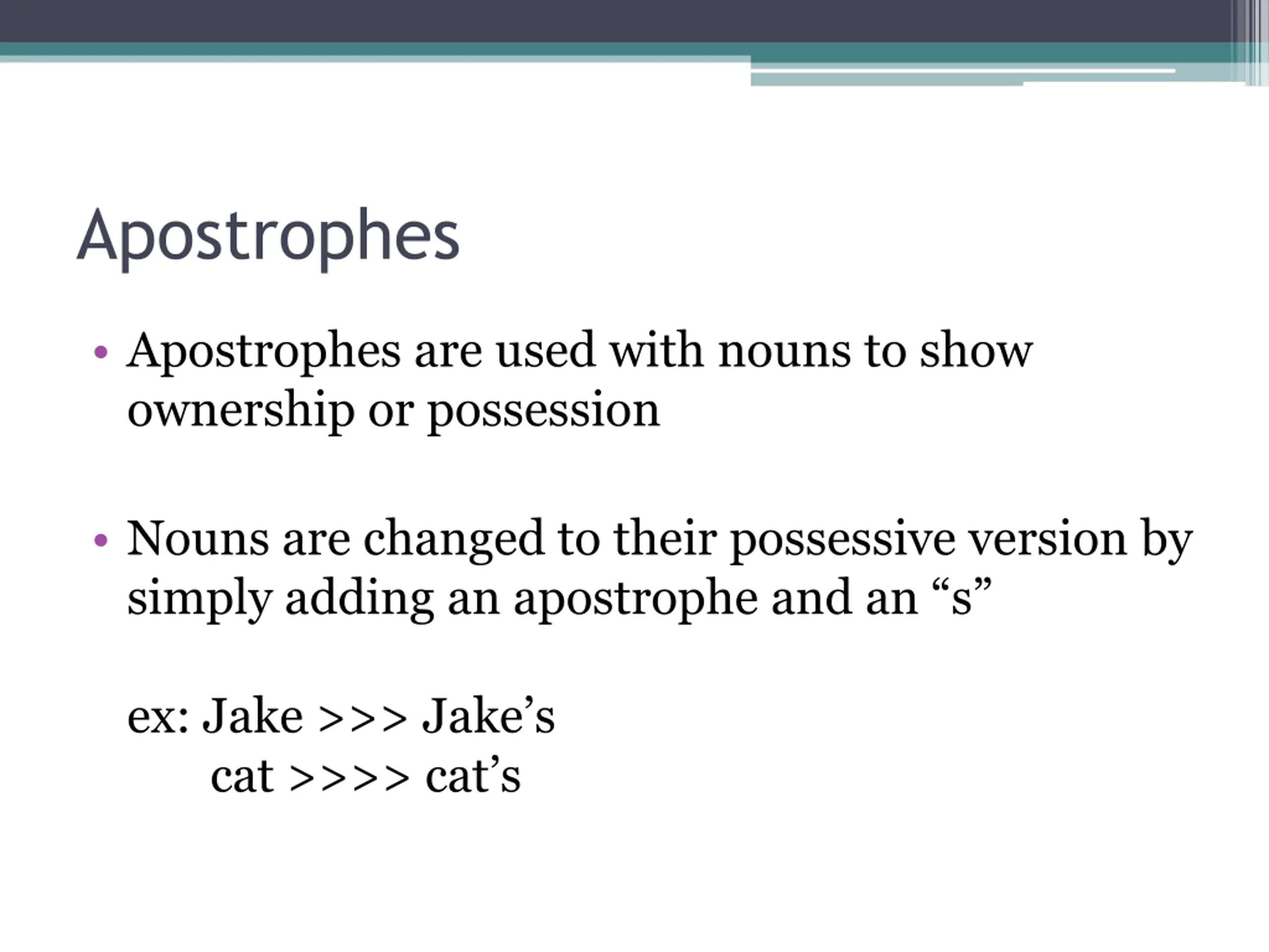 Apostrophes Apostrophes are used with nouns to show ownership or possession Nouns are changed to their possessive version by simply adding an apostrophe and an s ex: Jake >>> Jake s cat >>>> cat s