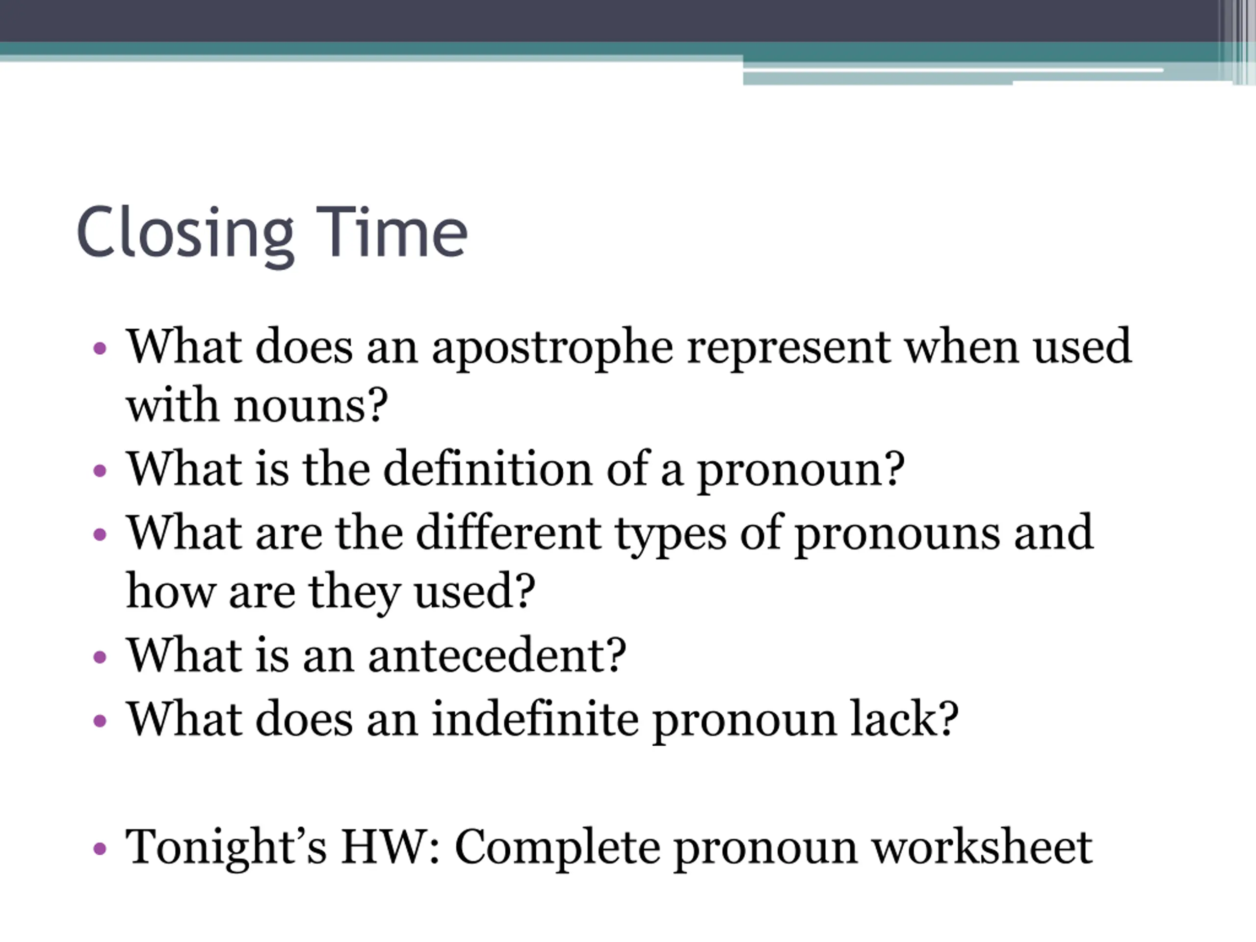 Closing Time What does an apostrophe represent when used with nouns? What is the definition of a pronoun? What are the different types of pronouns and how are they used? What is an antecedent? What does an indefinite pronoun lack? Tonight s HW: Complete pronoun worksheet