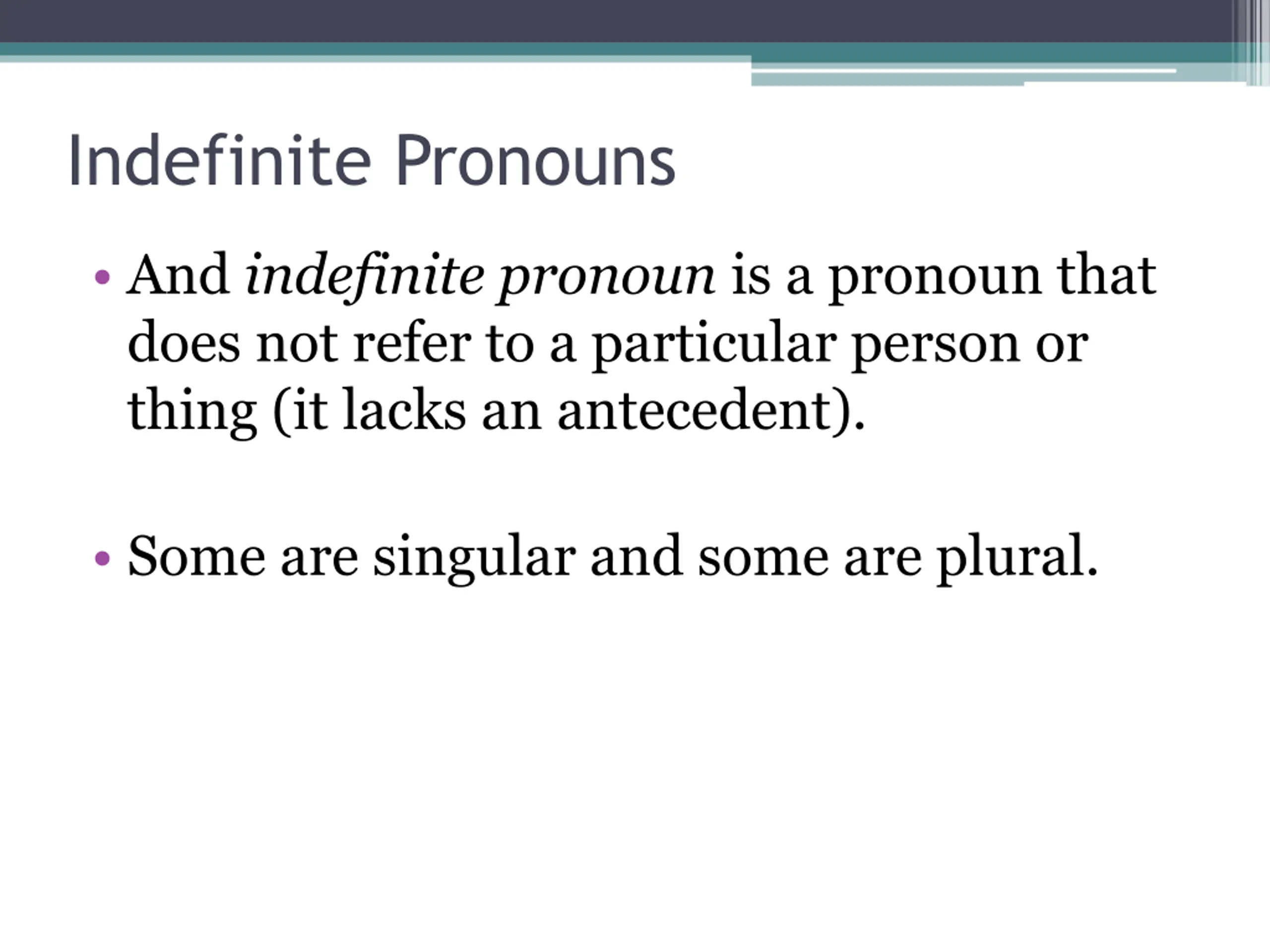 Indefinite Pronouns And indefinite pronoun is a pronoun that does not refer to a particular person or thing (it lacks an antecedent). Some are singular and some are plural.