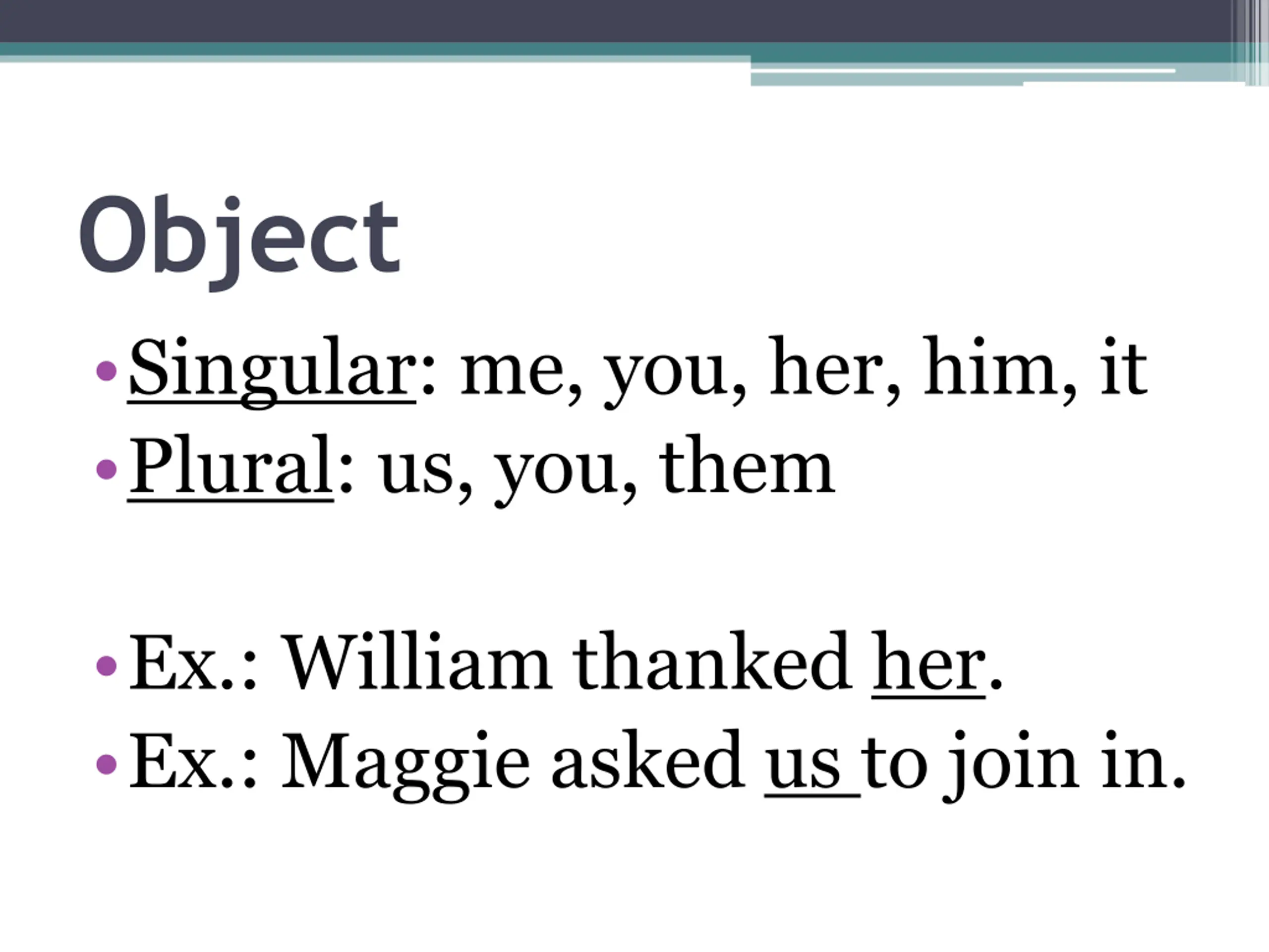 Object Singular: me, you, her, him, it Plural: us, you, them Ex.: William thanked her. Ex.: Maggie asked us to join in.