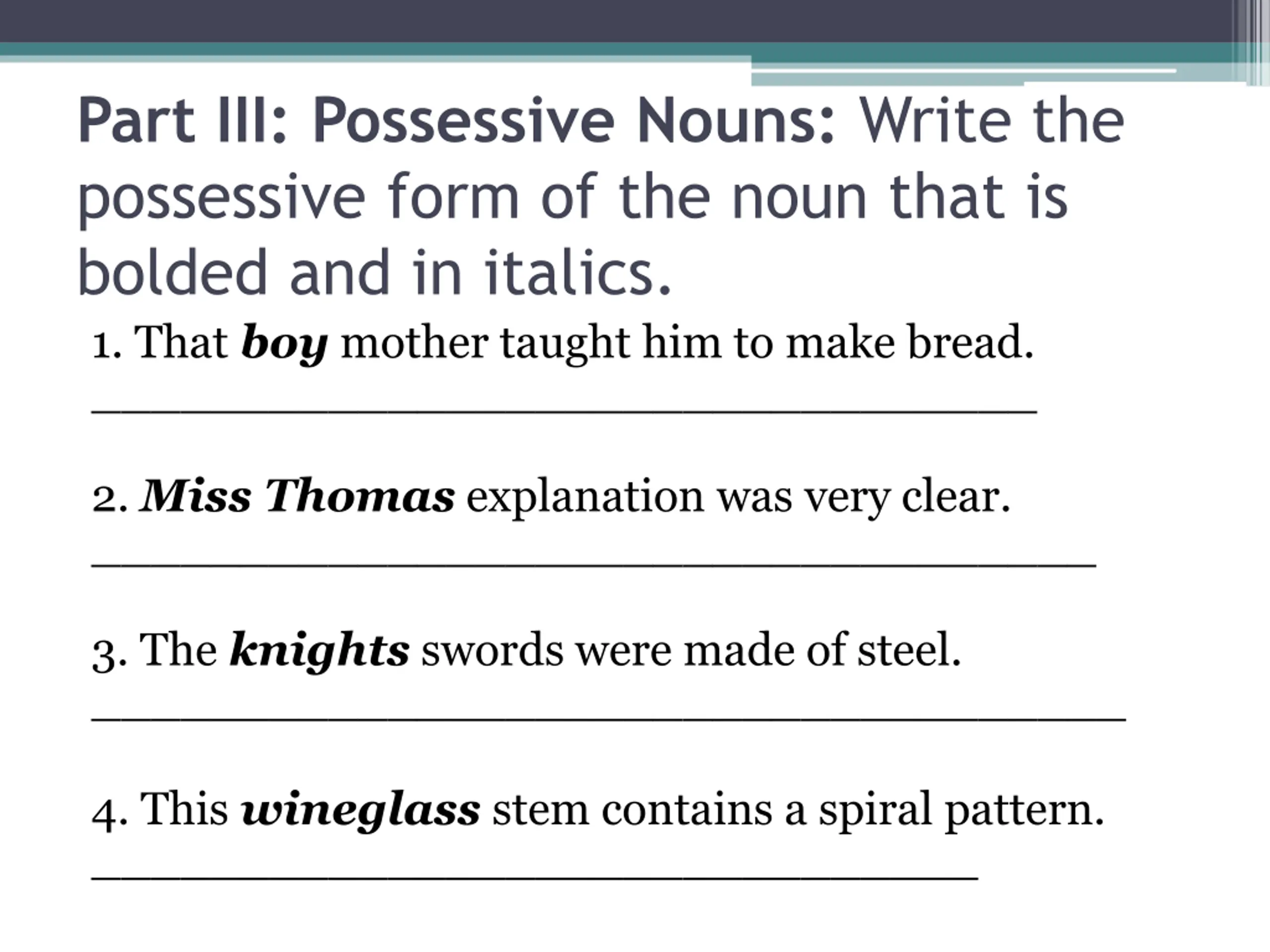 Part III: Possessive Nouns: Write the possessive form of the noun that is bolded and in italics. 1. That boy mother taught him to make bread. ________________________________ 2. Miss Thomas explanation was very clear. __________________________________ 3. The knights swords were made of steel. ___________________________________ 4. This wineglass stem contains a spiral pattern. ______________________________