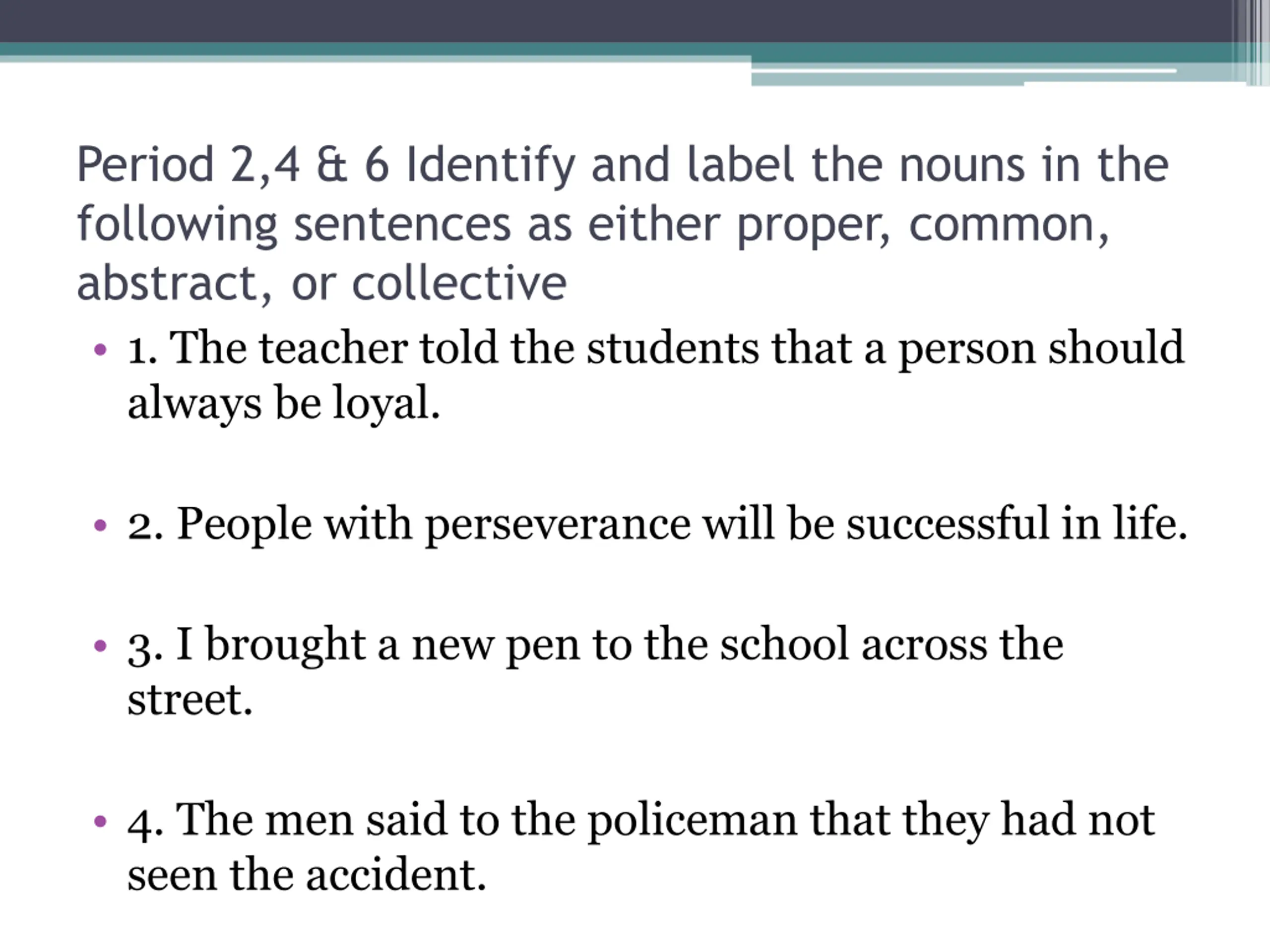 Period 2,4 & 6 Identify and label the nouns in the following sentences as either proper, common, abstract, or collective 1. The teacher told the students that a person should always be loyal. 2. People with perseverance will be successful in life. 3. I brought a new pen to the school across the street. 4. The men said to the policeman that they had not seen the accident.