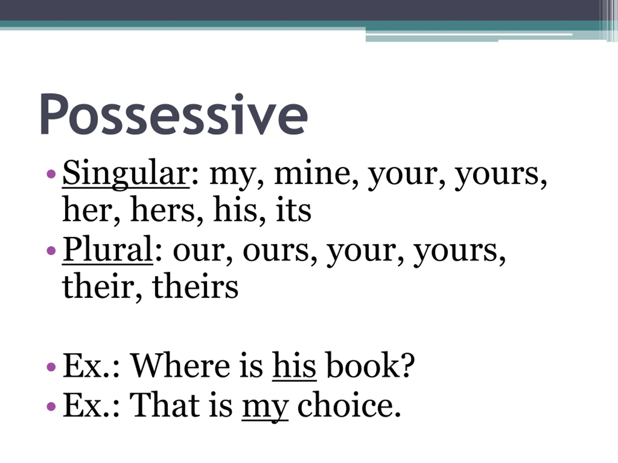 Possessive Singular: my, mine, your, yours, her, hers, his, its Plural: our, ours, your, yours, their, theirs Ex.: Where is his book? Ex.: That is my choice.