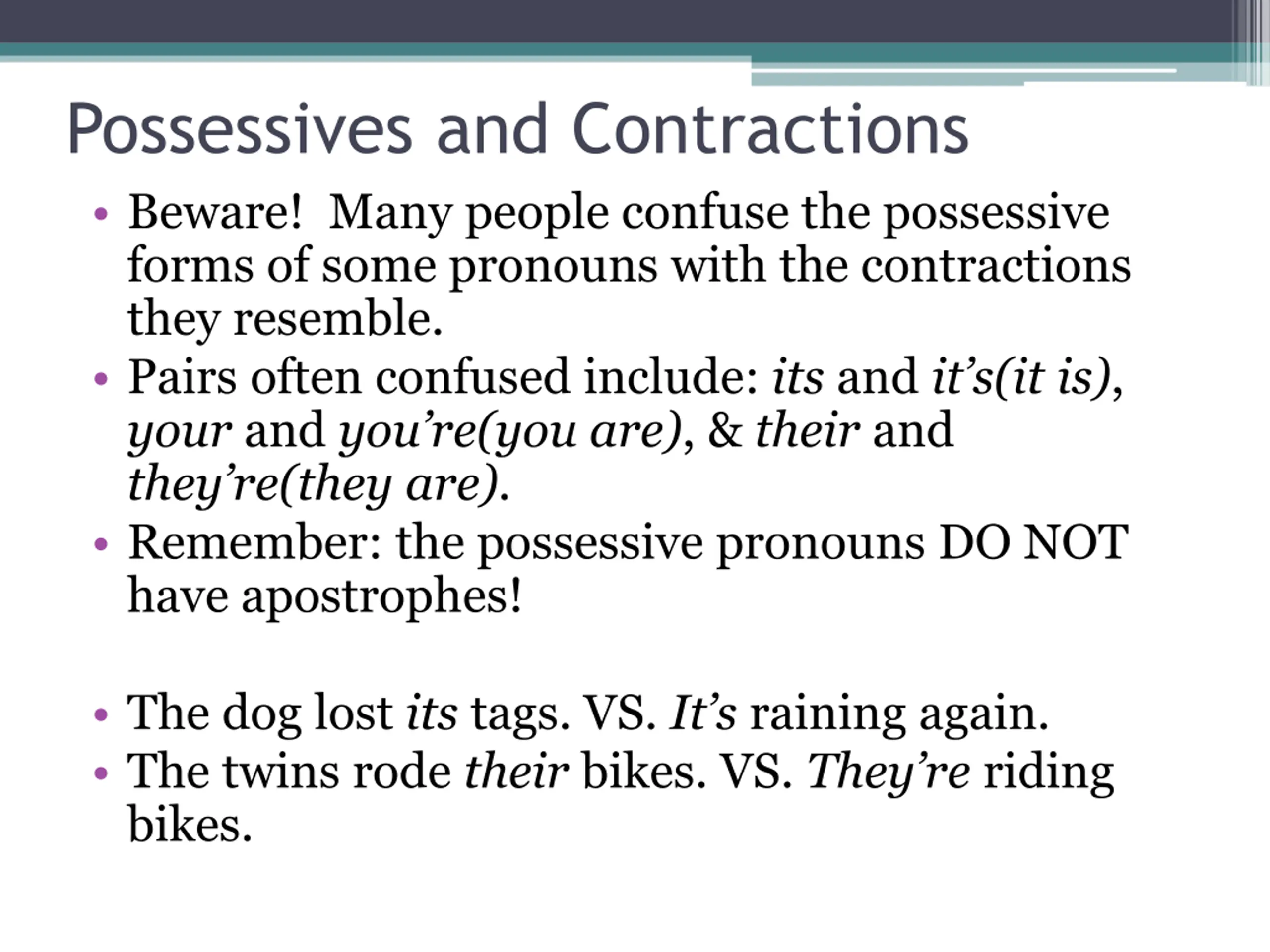 Possessives and Contractions Beware! Many people confuse the possessive forms of some pronouns with the contractions they resemble. Pairs often confused include: its and it s(it is), your and you re(you are), & their and they re(they are). Remember: the possessive pronouns DO NOT have apostrophes! The dog lost its tags. VS. It s raining again. The twins rode their bikes. VS. They re riding bikes.