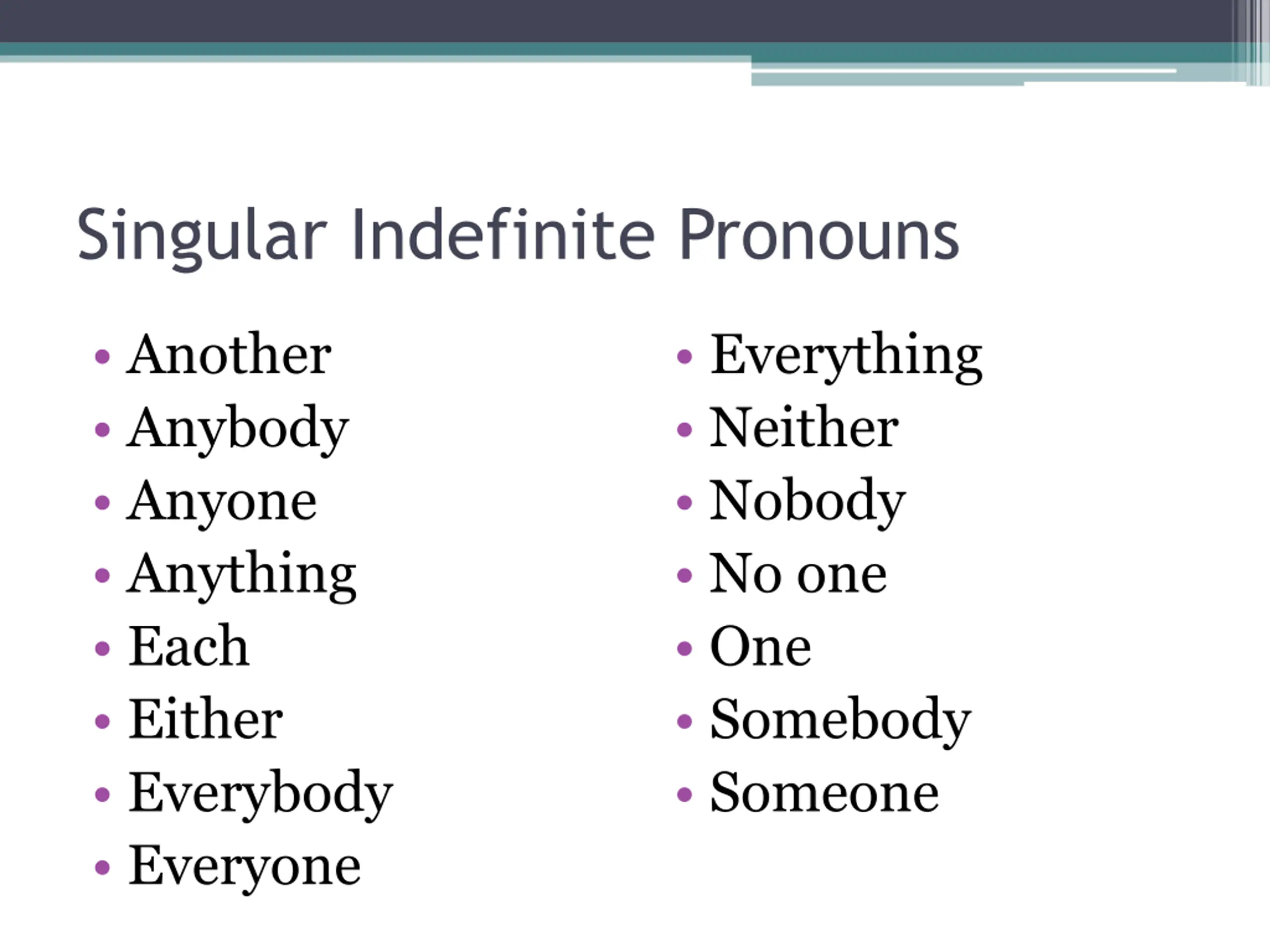 Singular Indefinite Pronouns Another Anybody Anyone Anything Each Either Everybody Everyone Everything Neither Nobody No one One Somebody Someone