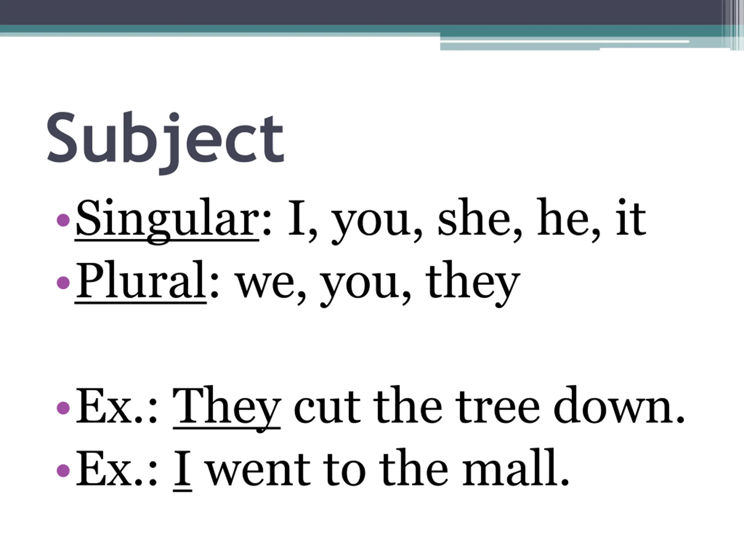 Subject Singular: I, you, she, he, it Plural: we, you, they Ex.: They cut the tree down. Ex.: I went to the mall.