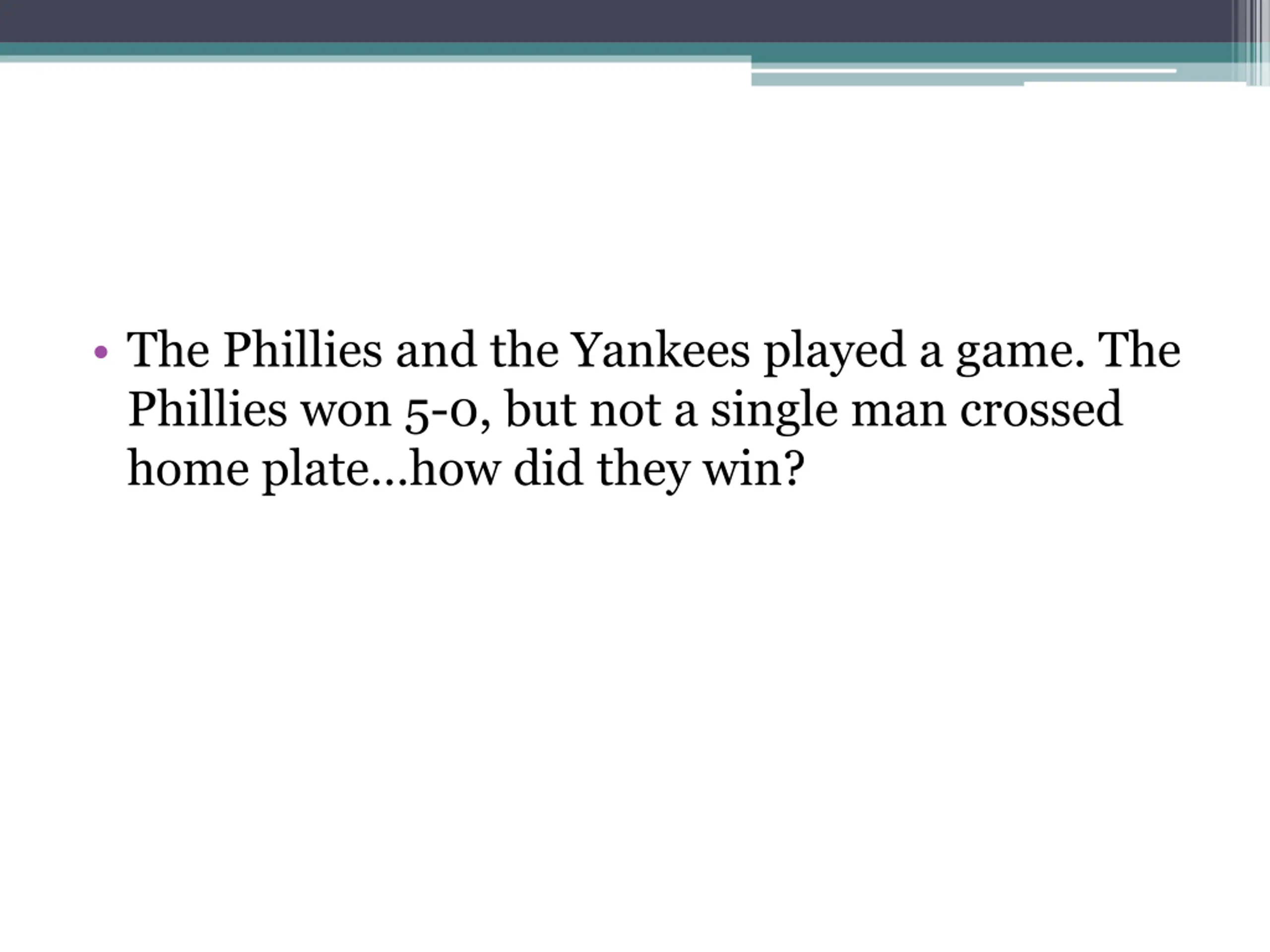 The Phillies and the Yankees played a game. The Phillies won 5-0, but not a single man crossed home plate how did they win?
