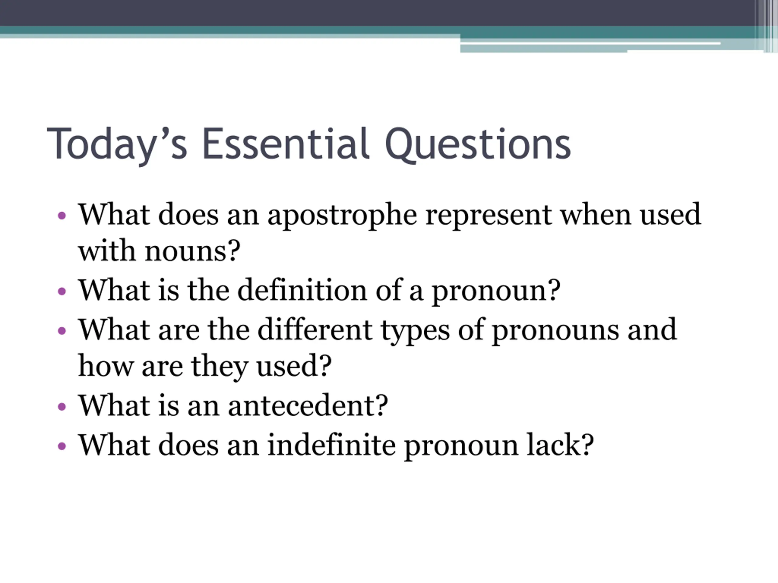 Todays Essential Questions What does an apostrophe represent when used with nouns? What is the definition of a pronoun? What are the different types of pronouns and how are they used? What is an antecedent? What does an indefinite pronoun lack?