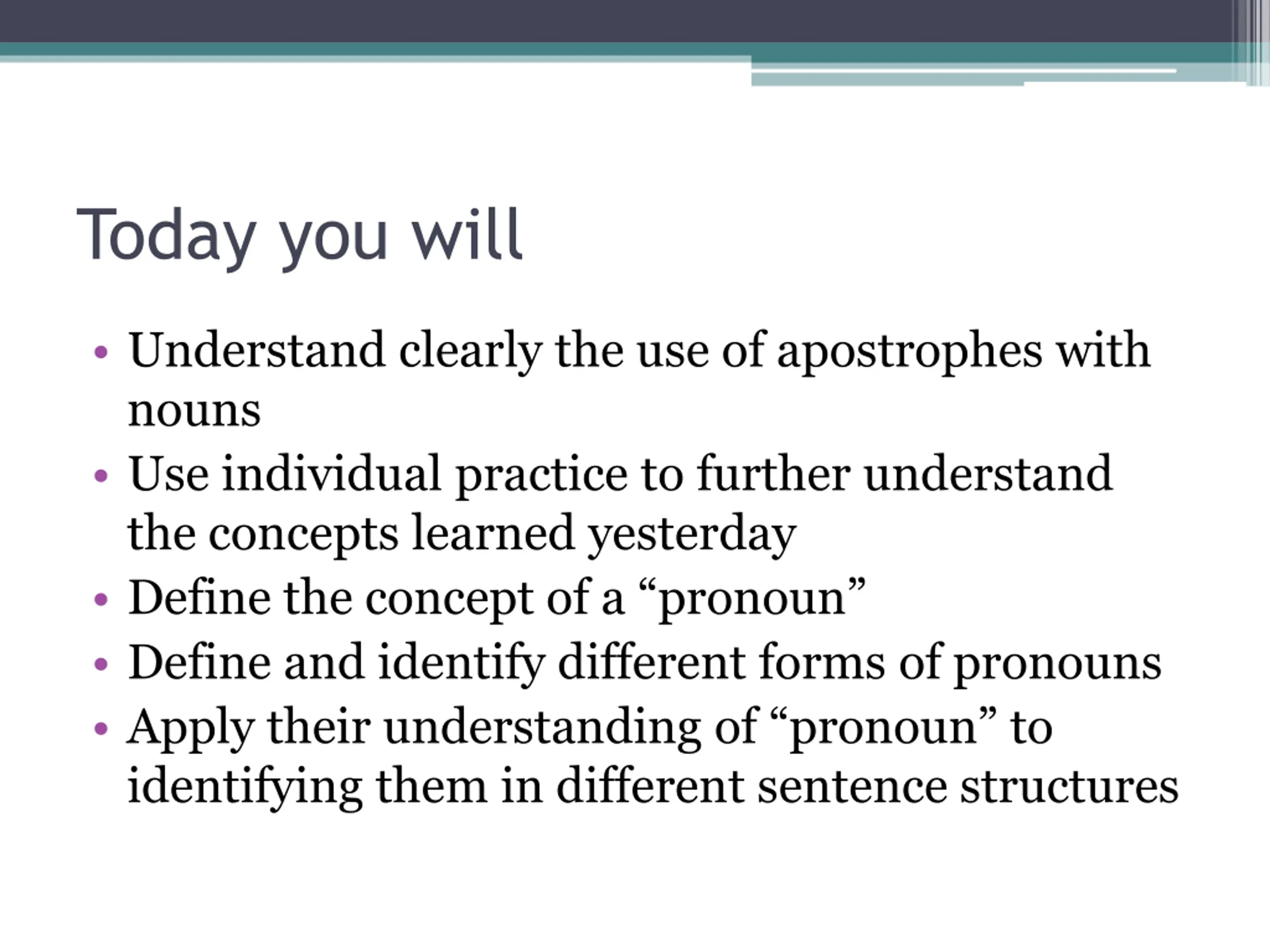 Today you will Understand clearly the use of apostrophes with nouns Use individual practice to further understand the concepts learned yesterday Define the concept of a pronoun Define and identify different forms of pronouns Apply their understanding of pronoun to identifying them in different sentence structures