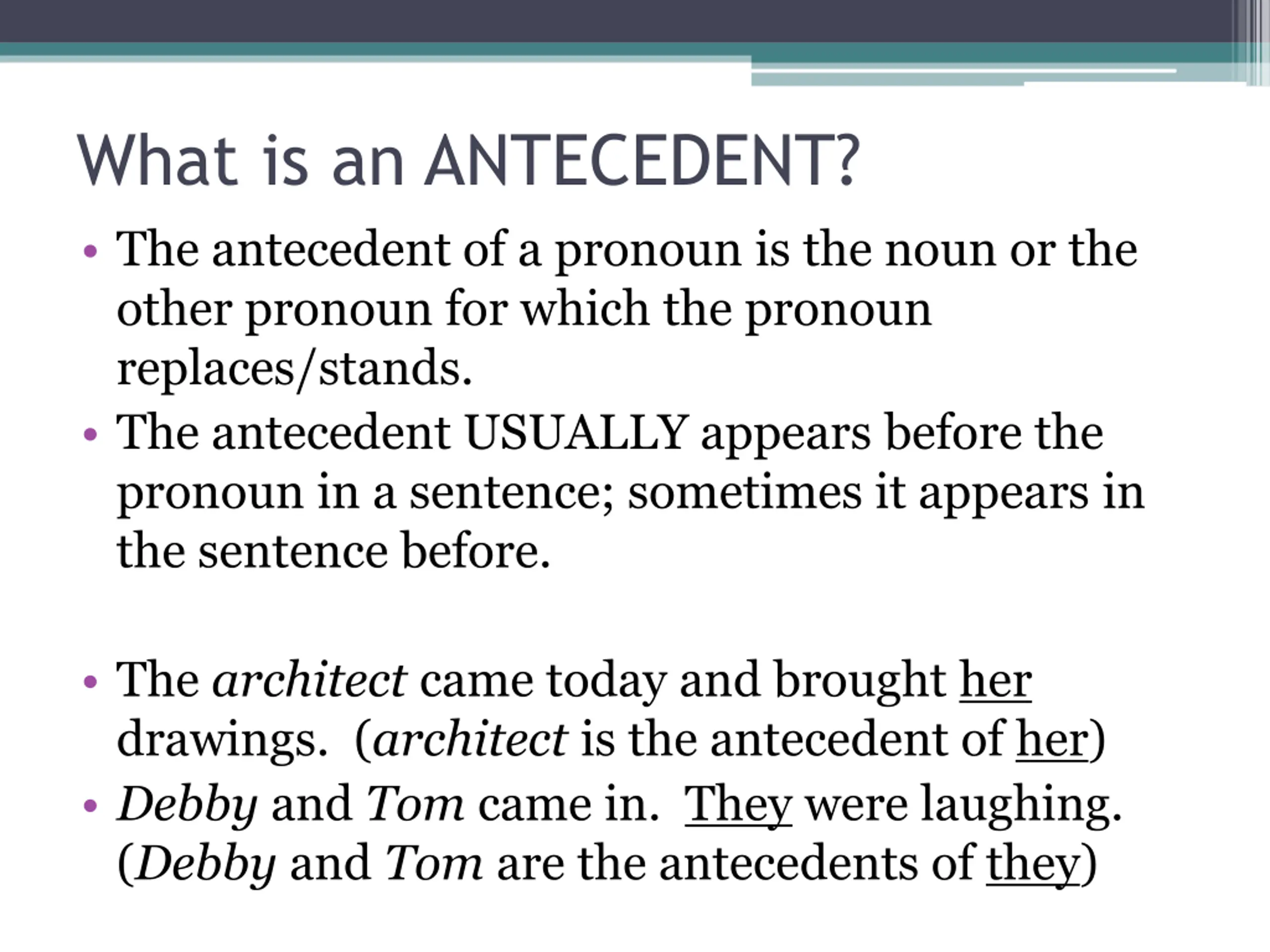 What is an ANTECEDENT? The antecedent of a pronoun is the noun or the other pronoun for which the pronoun replaces/stands. The antecedent USUALLY appears before the pronoun in a sentence; sometimes it appears in the sentence before. The architect came today and brought her drawings. (architect is the antecedent of her) Debby and Tom came in. They were laughing. (Debby and Tom are the antecedents of they)