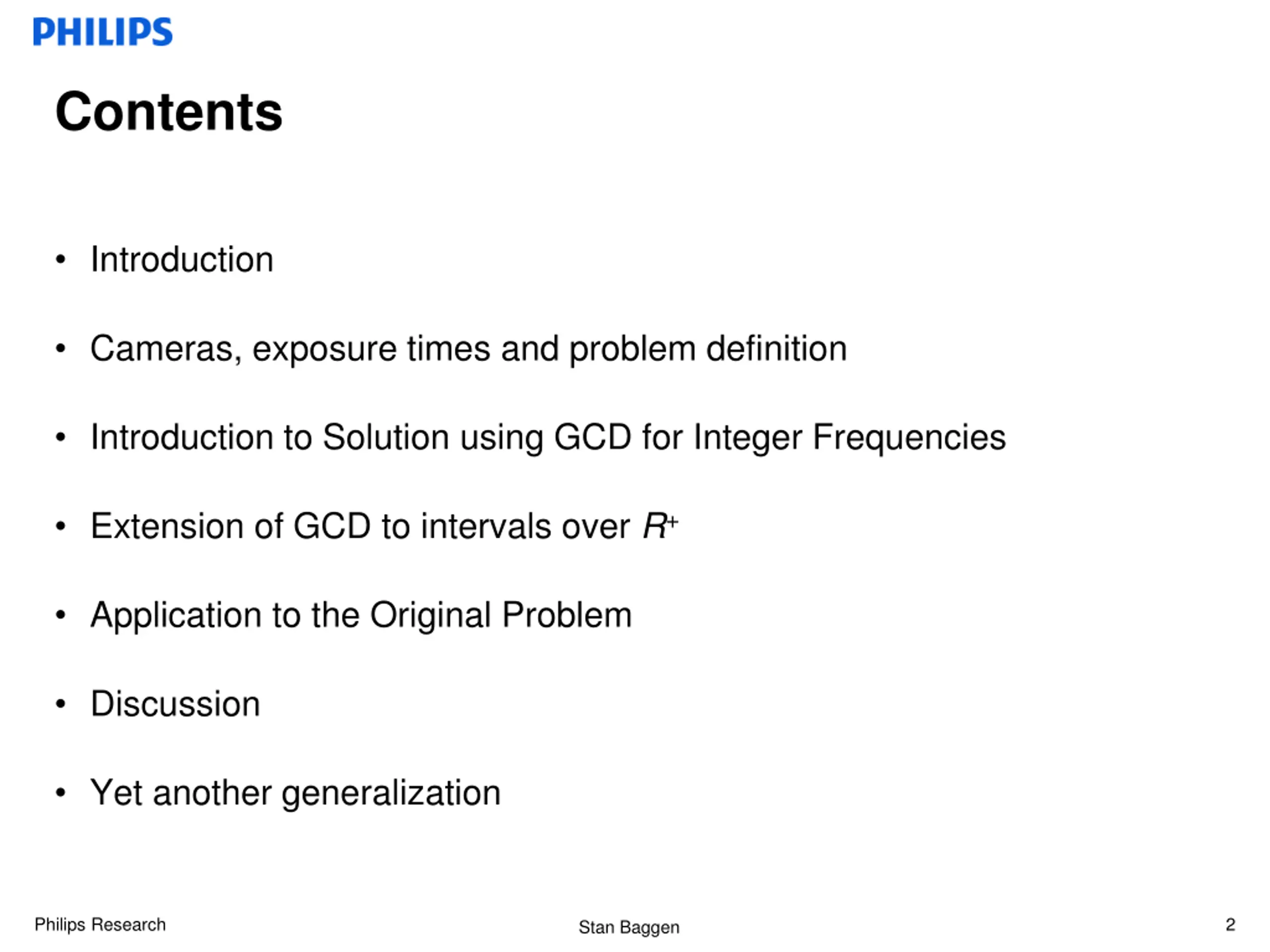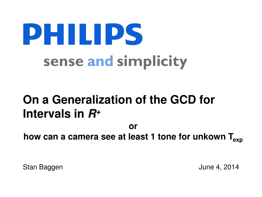 Contents Introduction Cameras, exposure times and problem definition Introduction to Solution using GCD for Integer Frequencies Extension of GCD to intervals over R+ Application to the Original Problem Discussion Yet another generalization Philips Research 2 Stan Baggen