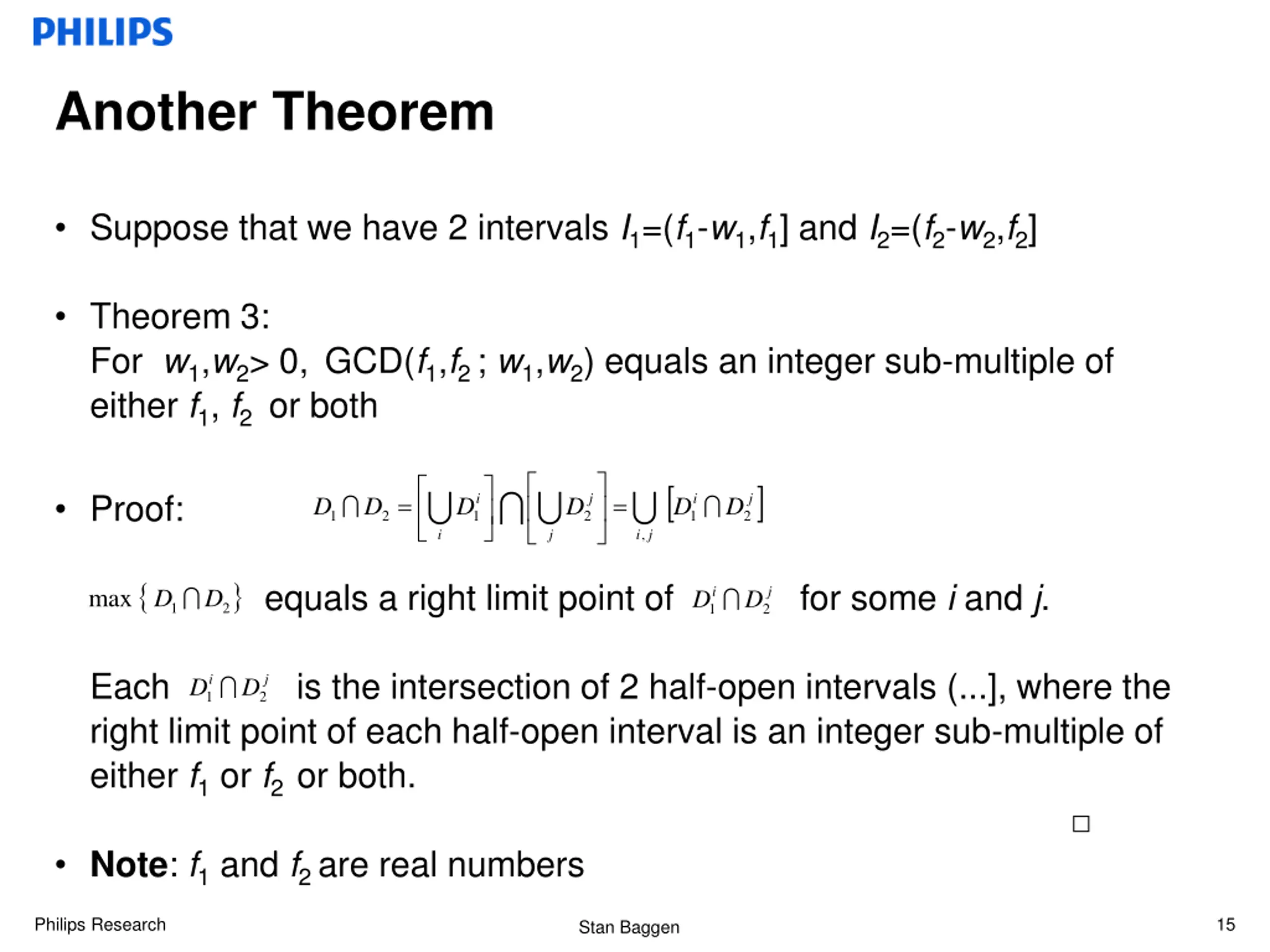 Another Theorem Suppose that we have 2 intervals I1=(f1-w1,f1] and I2=(f2-w2,f2] Theorem 3: For w1,w2> 0, GCD(f1,f2 ; w1,w2) equals an integer sub-multiple of either f1, f2 or both Proof: = = i j i j i i , D D D D D D 1 2 1 2 1 2 j j equals a right limit point of for some i and j. 2 1 max D D i j D D 1 2 Each is the intersection of 2 half-open intervals (...], where the right limit point of each half-open interval is an integer sub-multiple of either f1 or f2 or both. Note: f1 and f2 are real numbers i j D D 1 2 Philips Research 15 Stan Baggen