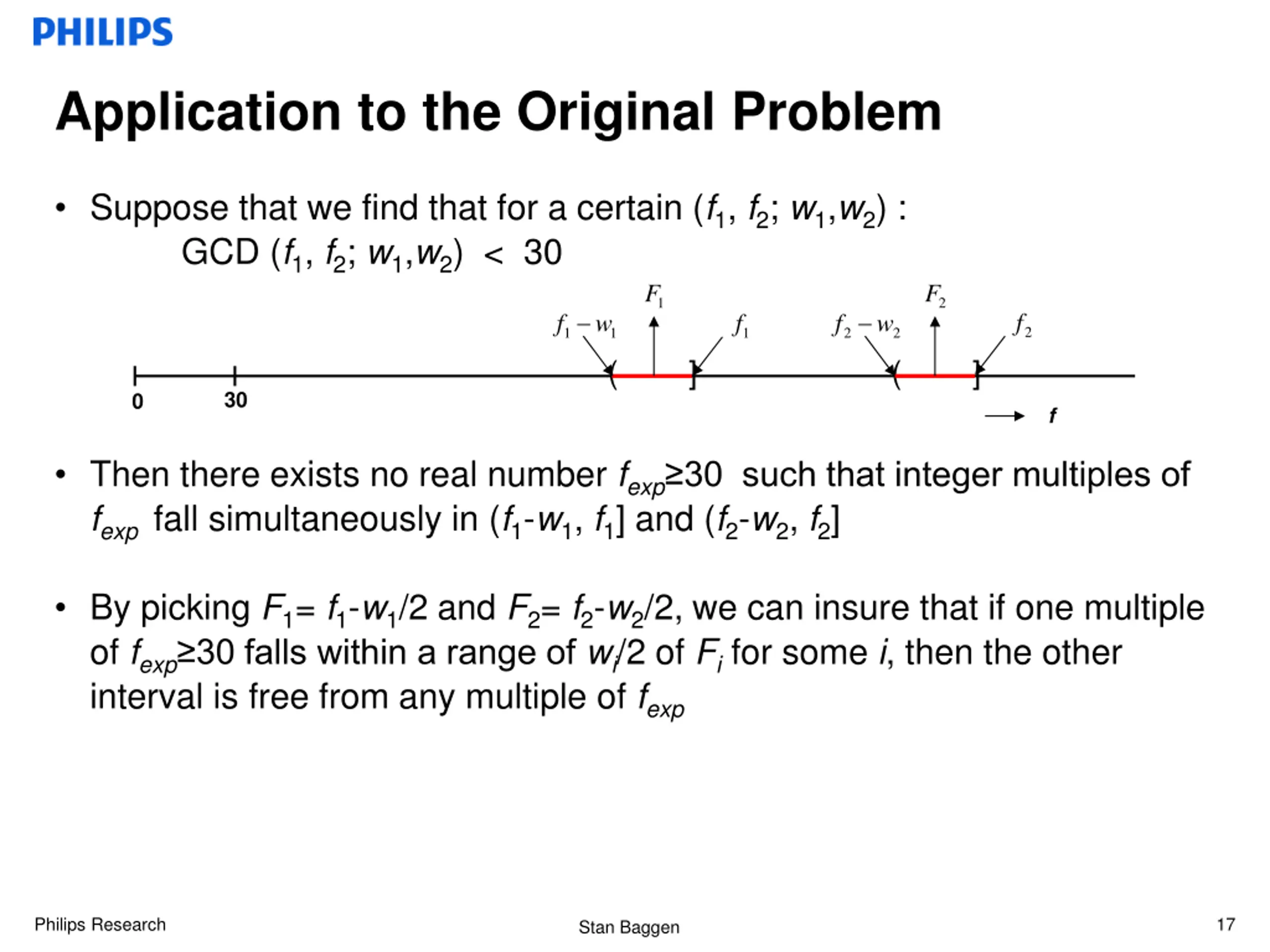 Application to the Original Problem Suppose that we find that for a certain (f1, f2; w1,w2) : GCD (f1, f2; w1,w2) < 30 1 F 2 F f f 2f w w 1f 2 2 ( ] 1 1 ( ] 30 0 f Then there exists no real number fexp 30 such that integer multiples of fexp fall simultaneously in (f1-w1, f1] and (f2-w2, f2] By picking F1= f1-w1/2 and F2= f2-w2/2, we can insure that if one multiple of fexp 30 falls within a range of wi/2 of Fi for some i, then the other interval is free from any multiple of fexp Philips Research 17 Stan Baggen