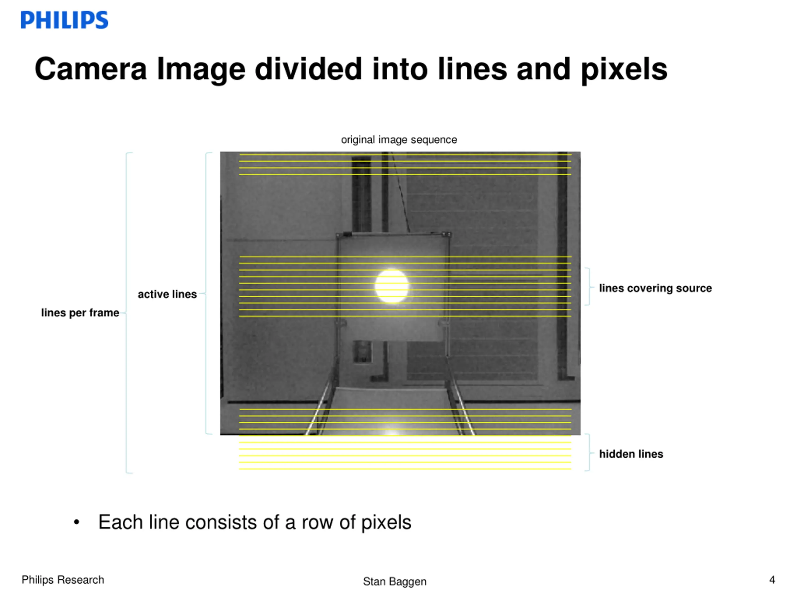 Camera Image divided into lines and pixels original image sequence lines covering source active lines lines per frame hidden lines Each line consists of a row of pixels Philips Research 4 Stan Baggen