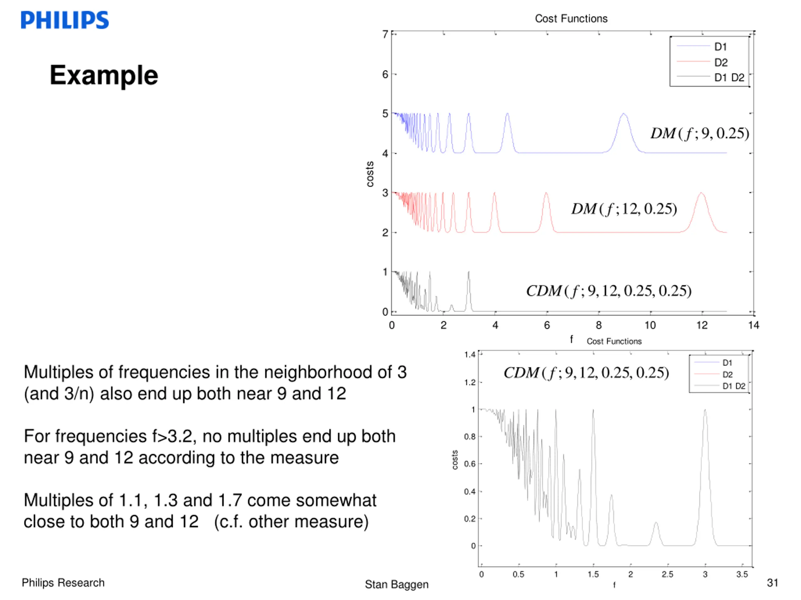 Cost Functions 7 D1 D2 D1 D2 Example 6 5 ( f , 9 ; . 0 25 ) DM 4 costs 3 ( f ; 12 . 0 , 25 ) DM 2 1 ( f , 9 ; 12 . 0 , 25 . 0 , 25 ) CDM 0 0 2 4 6 8 10 12 14 f Cost Functions 1.4 D1 D2 D1 D2 Multiples of frequencies in the neighborhood of 3 (and 3/n) also end up both near 9 and 12 ( f , 9 ; 12 . 0 , 25 . 0 , 25 ) CDM 1.2 1 For frequencies f>3.2, no multiples end up both near 9 and 12 according to the measure 0.8 costs 0.6 0.4 Multiples of 1.1, 1.3 and 1.7 come somewhat close to both 9 and 12 (c.f. other measure) 0.2 0 0 0.5 1 1.5 2 2.5 3 3.5 Philips Research 31 Stan Baggen f