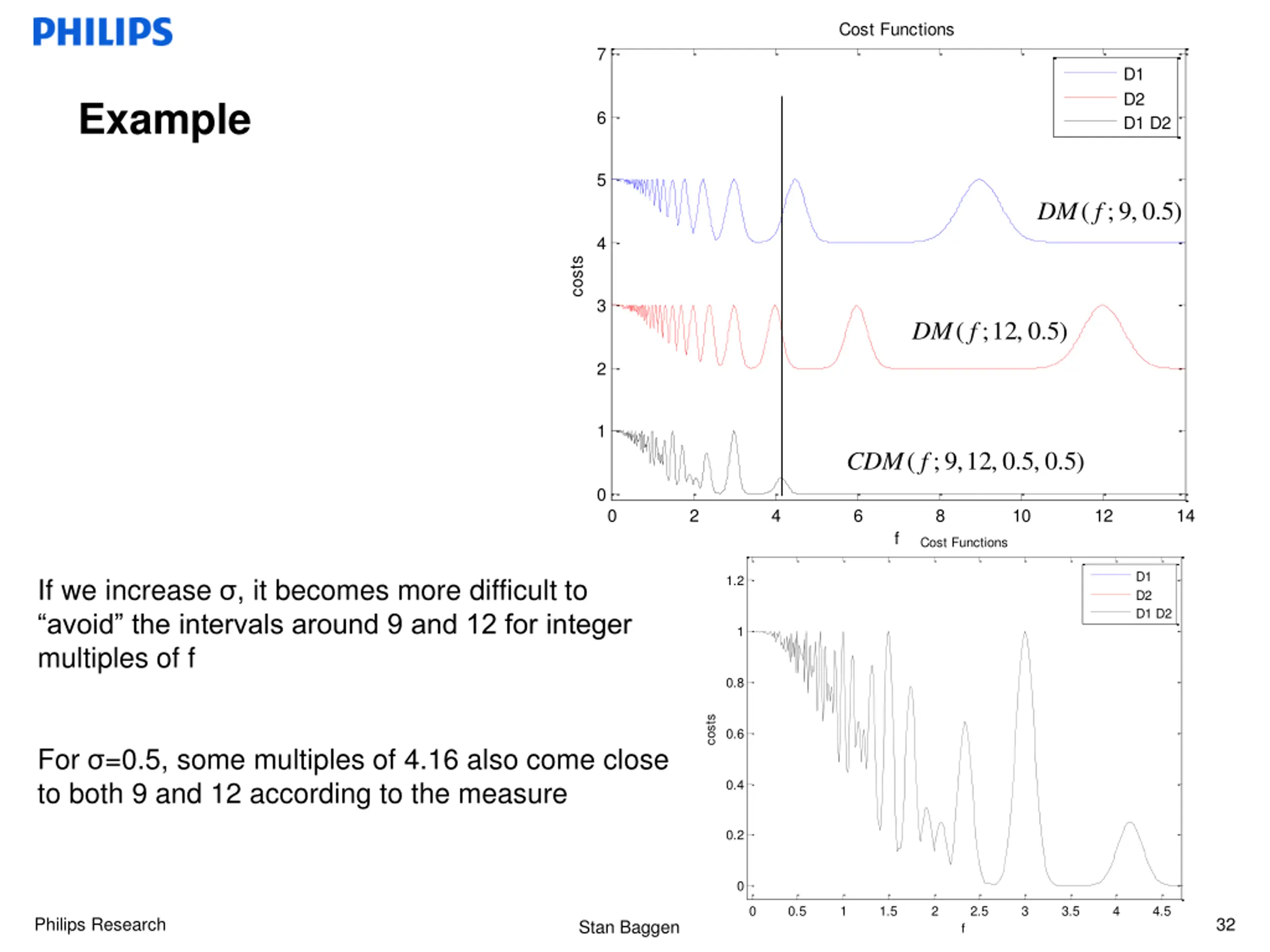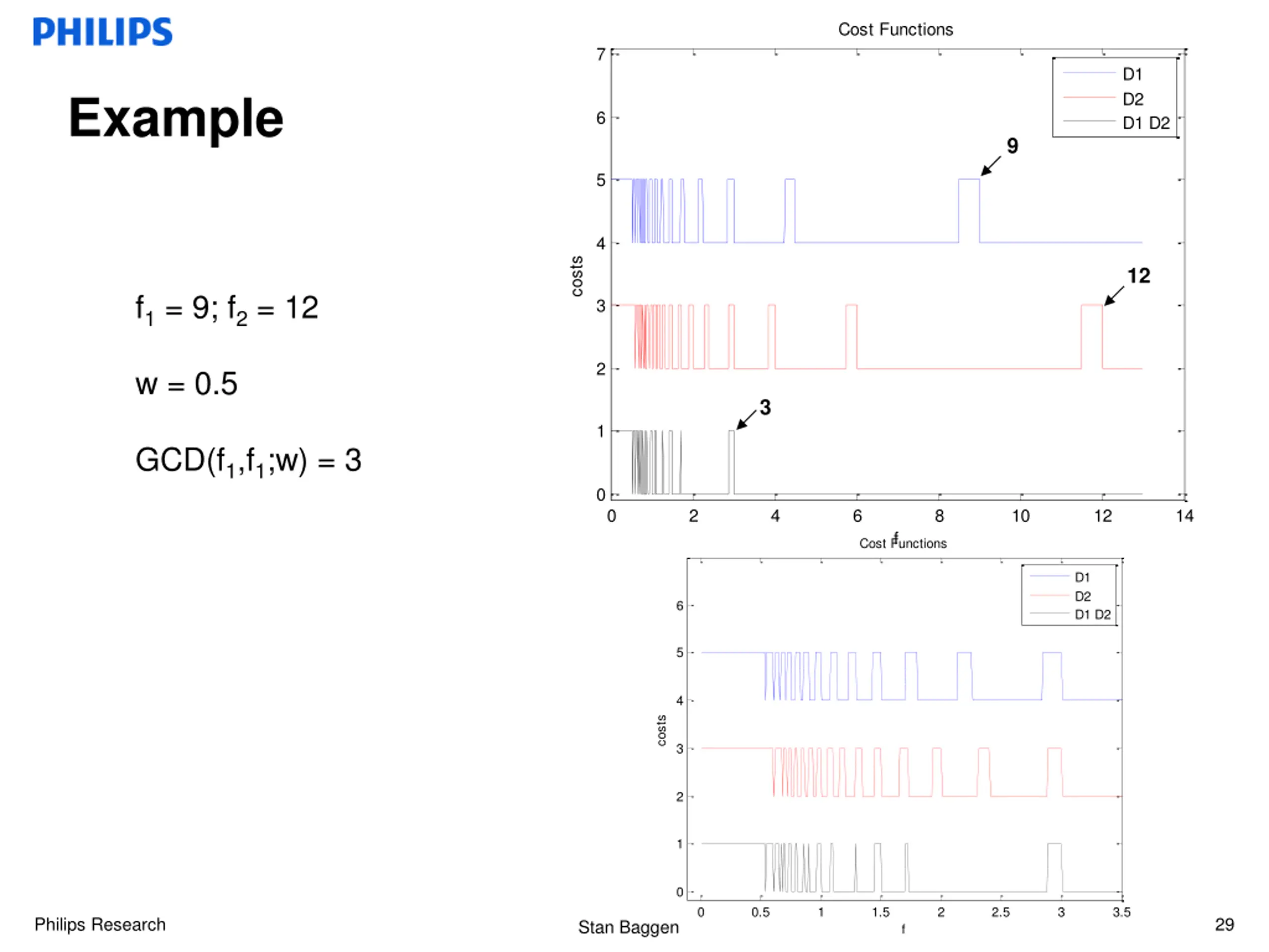 Cost Functions 7 D1 D2 D1 D2 Example 6 9 5 4 costs 12 f1 = 9; f2 = 12 3 2 w = 0.5 3 1 GCD(f1,f1;w) = 3 0 0 2 4 6 8 10 12 14 f Cost Functions D1 D2 D1 D2 6 5 4 costs 3 2 1 0 0 0.5 1 1.5 2 2.5 3 3.5 Philips Research 29 Stan Baggen f