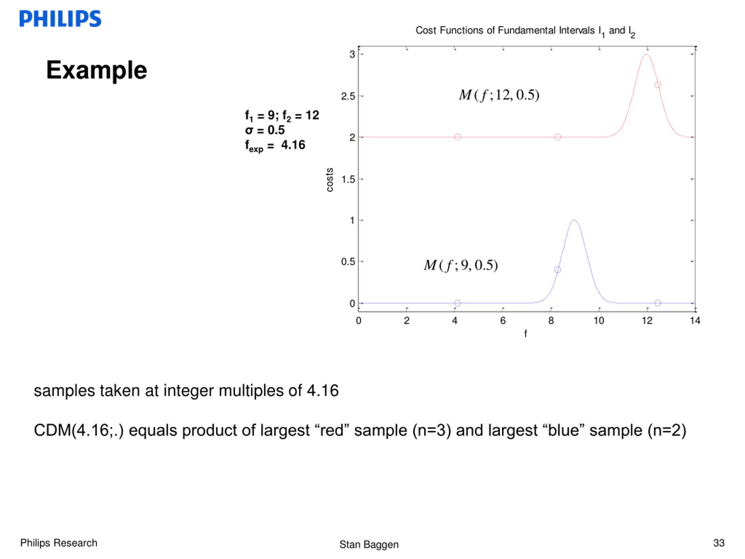 Cost Functions of Fundamental Intervals I1 and I2 3 Example ( f ; ) 5 . 0 , 12 M 2.5 f1 = 9; f2 = 12 = 0.5 fexp = 4.16 2 costs 1.5 1 0.5 ( f , 9 ; ) 5 . 0 M 0 0 2 4 6 8 10 12 14 f samples taken at integer multiples of 4.16 CDM(4.16;.) equals product of largest red sample (n=3) and largest blue sample (n=2) Philips Research 33 Stan Baggen