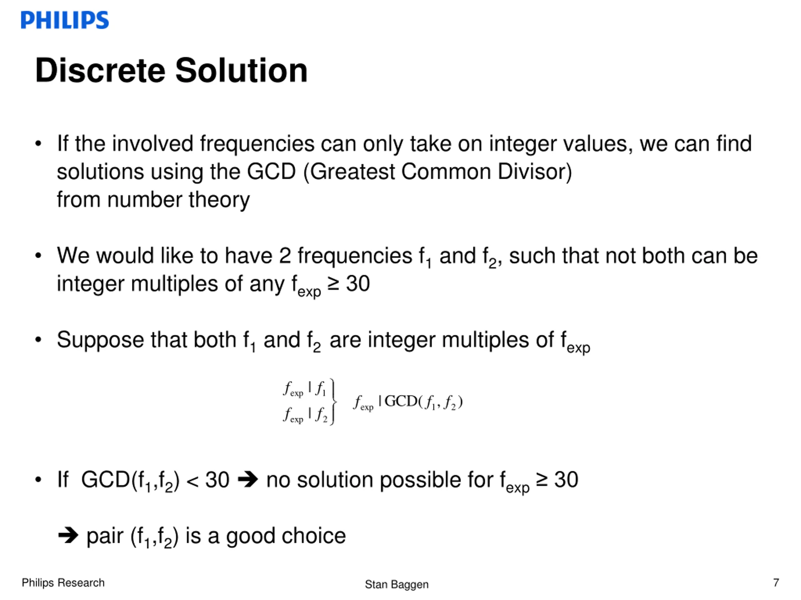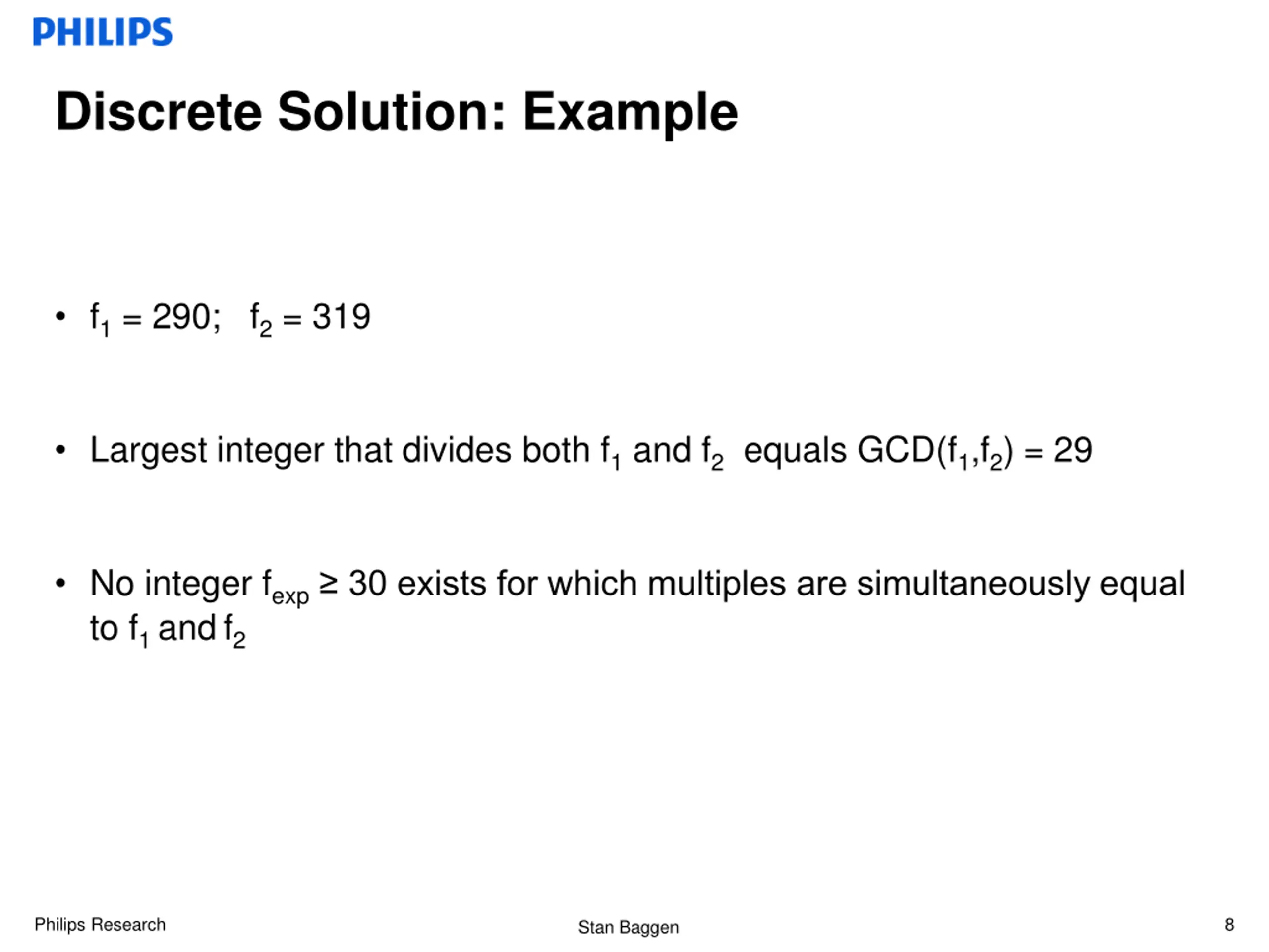 Discrete Solution If the involved frequencies can only take on integer values, we can find solutions using the GCD (Greatest Common Divisor) from number theory We would like to have 2 frequencies f1 and f2, such that not both can be integer multiples of any fexp 30 Suppose that both f1 and f2 are integer multiples of fexp | f f exp 1 | GCD( , ) f f f exp 1 2 | f f exp 2 If GCD(f1,f2) < 30 no solution possible for fexp 30 pair (f1,f2) is a good choice Philips Research 7 Stan Baggen