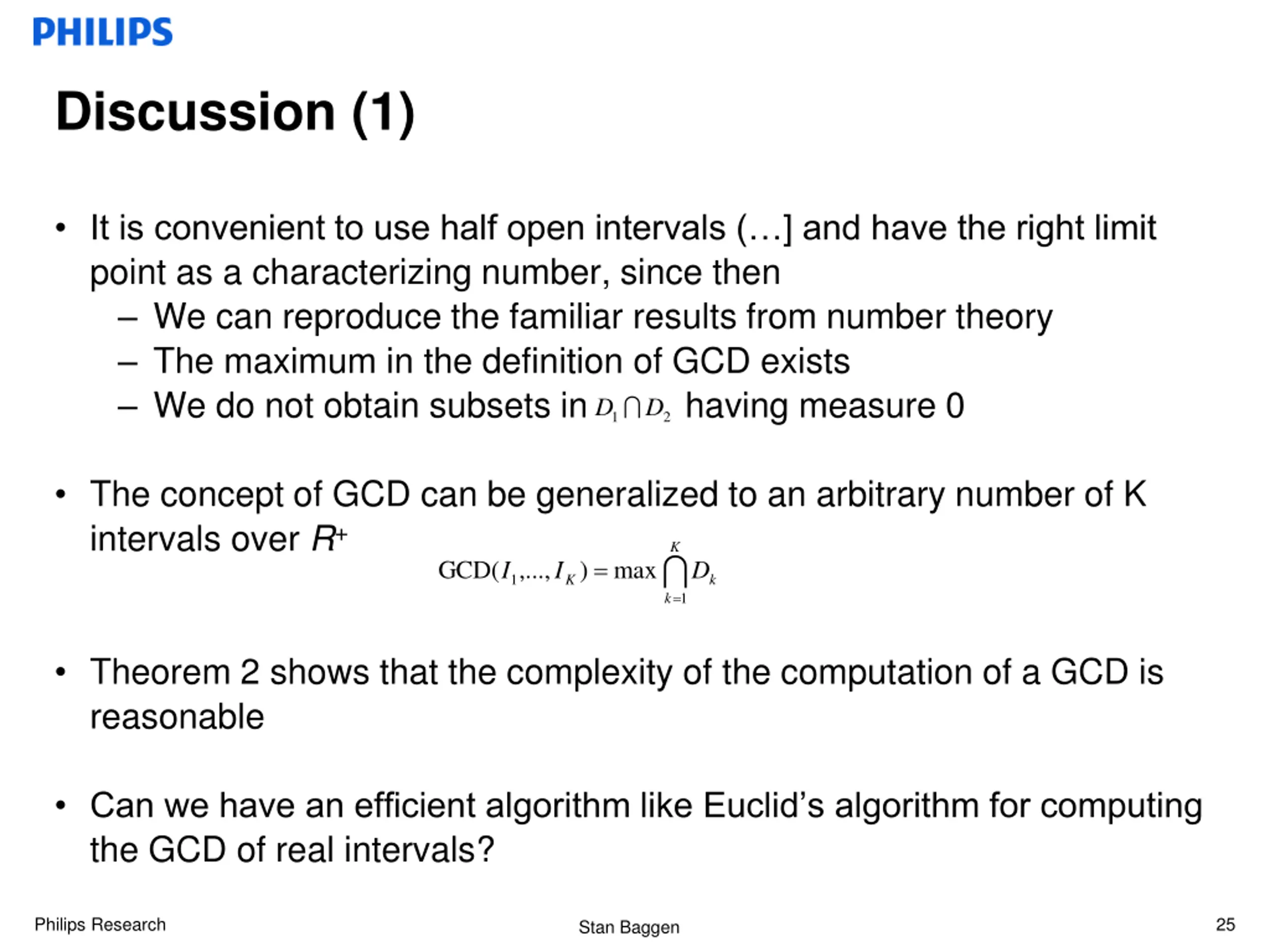 Discussion (1) It is convenient to use half open intervals ( ] and have the right limit point as a characterizing number, since then We can reproduce the familiar results from number theory The maximum in the definition of GCD exists We do not obtain subsets in having measure 0 D D 1 2 The concept of GCD can be generalized to an arbitrary number of K intervals over R+ I I 1 ) ,..., GCD( = K k = max D K k 1 Theorem 2 shows that the complexity of the computation of a GCD is reasonable Can we have an efficient algorithm like Euclid s algorithm for computing the GCD of real intervals? Philips Research 25 Stan Baggen