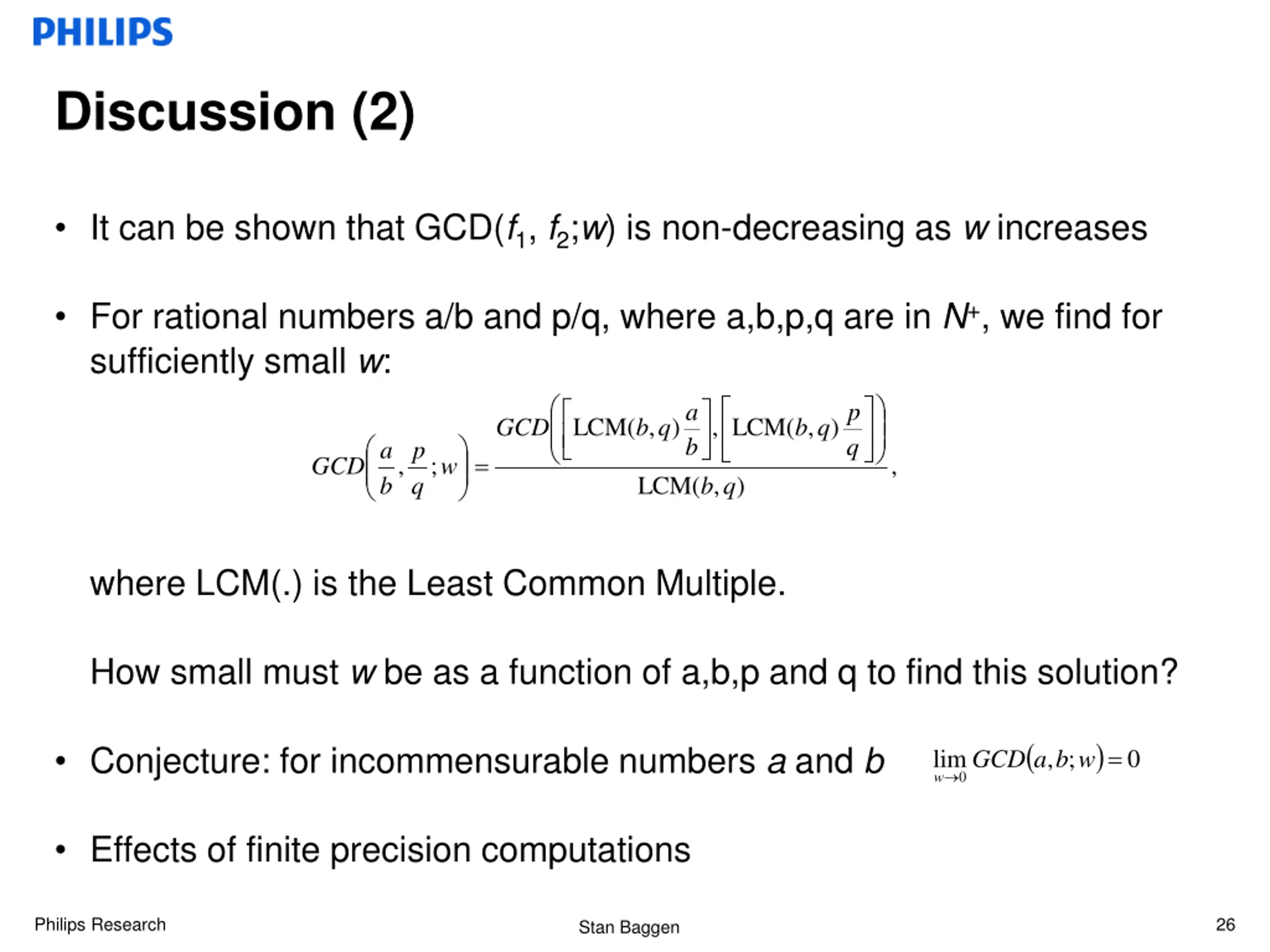 Discussion (2) It can be shown that GCD(f1, f2;w) is non-decreasing as w increases For rational numbers a/b and p/q, where a,b,p,q are in N+, we find for sufficiently small w: = a p LCM( , ) , LCM( , ) GCD b q b q b q a p , ; , GCD w LCM( , ) b q b q where LCM(.) is the Least Common Multiple. How small must w be as a function of a,b,p and q to find this solution? ( ) Conjecture: for incommensurable numbers a and b = lim w , ; 0 GCD a b w 0 Effects of finite precision computations Philips Research 26 Stan Baggen