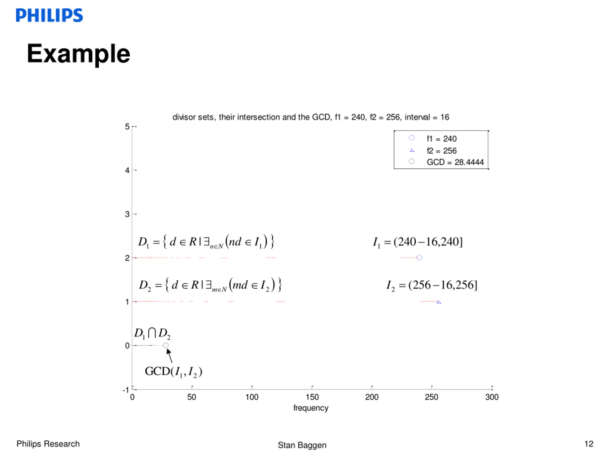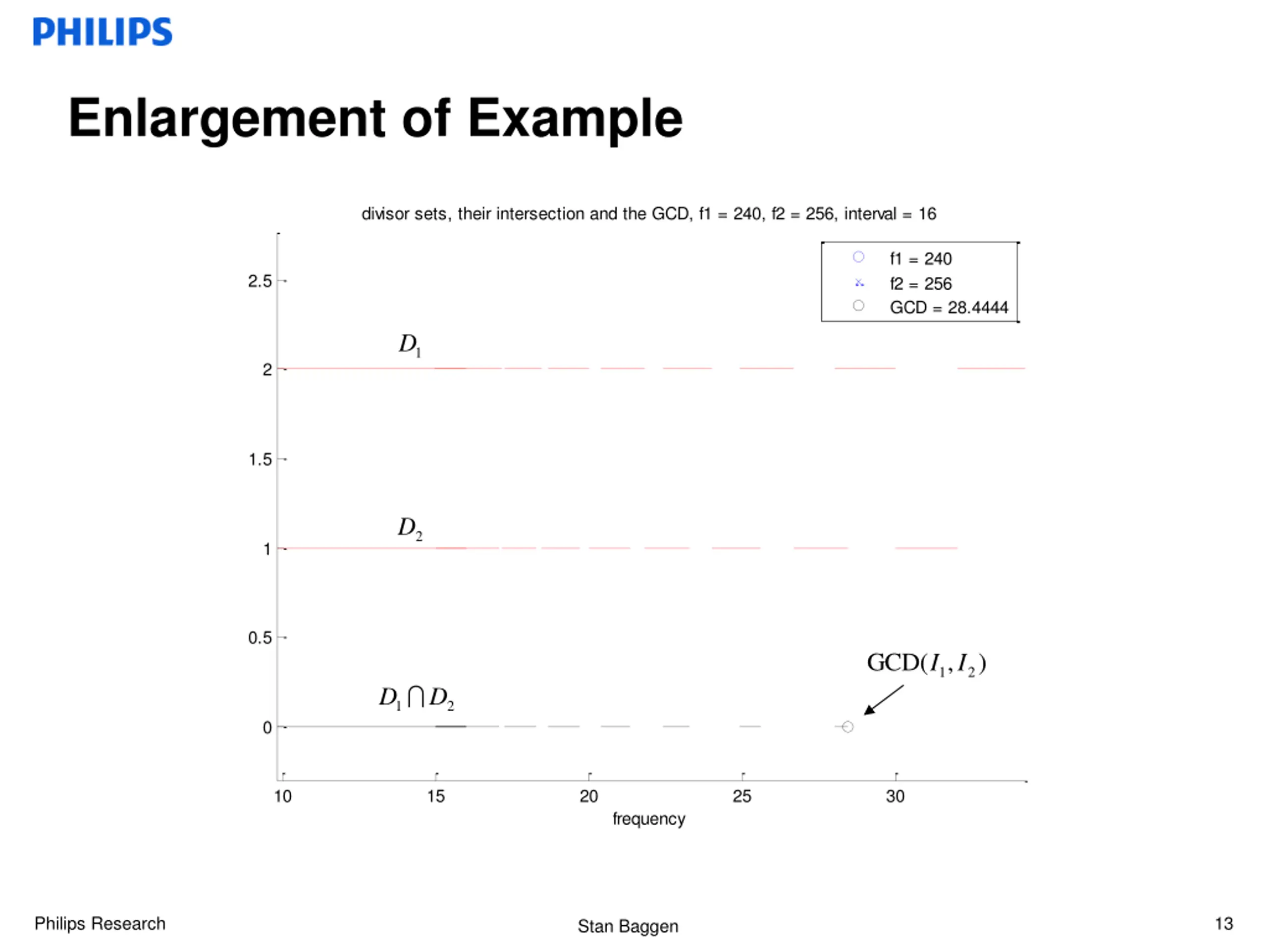 Example divisor sets, their intersection and the GCD, f1 = 240, f2 = 256, interval = 16 5 f1 = 240 f2 = 256 GCD = 28.4444 4 3 ( ) = = | ( 240 16 , 240 ] D d R nd I I 1 1 1 n N 2 ( ) = = | ( 256 16 , 256 ] D d R md I I 2 2 2 m N 1 D D 1 2 0 GCD( , ) I 1I 2 -1 0 50 100 150 200 250 300 frequency Philips Research 12 Stan Baggen