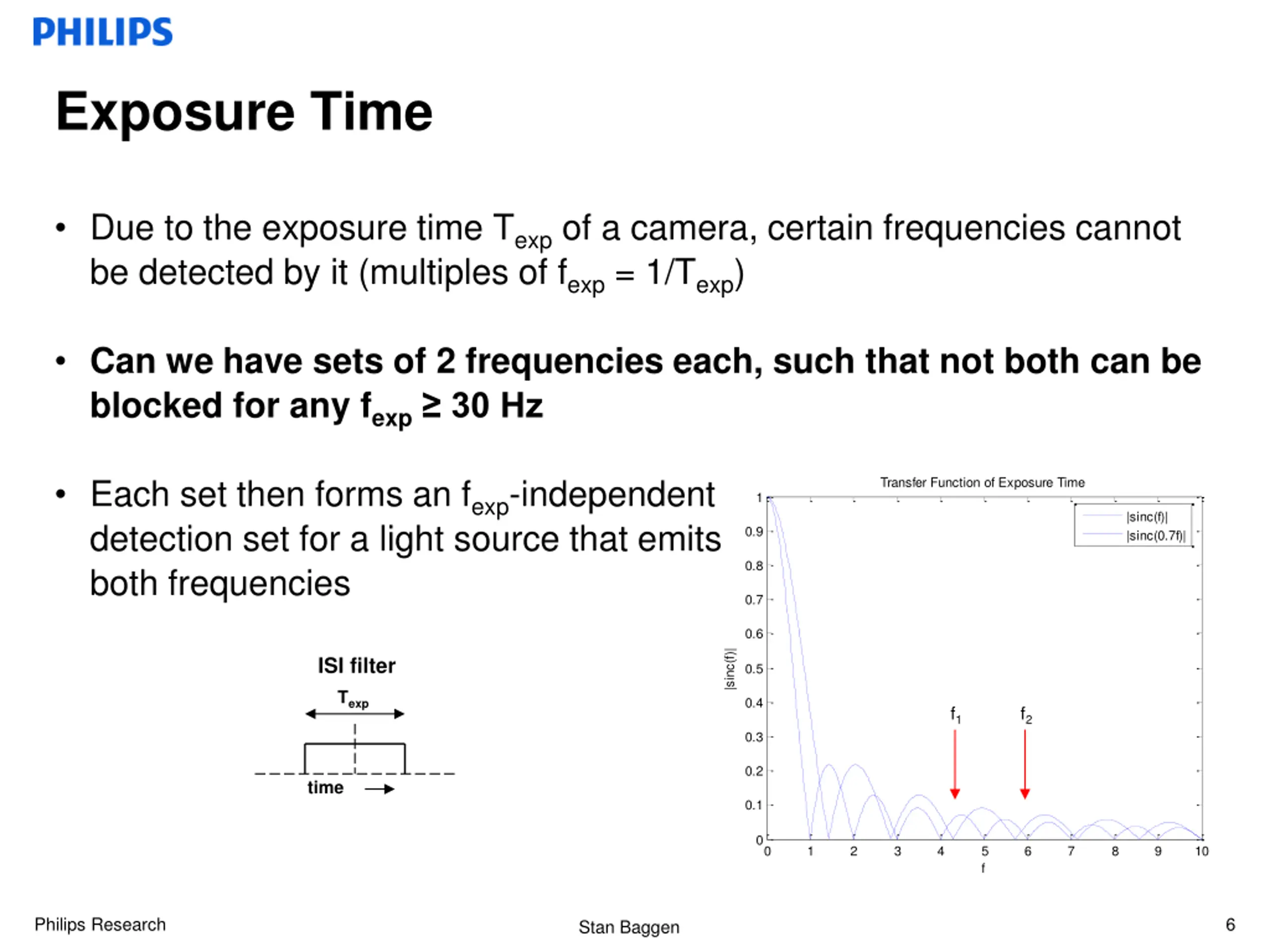 Exposure Time Due to the exposure time Texp of a camera, certain frequencies cannot be detected by it (multiples of fexp = 1/Texp) Can we have sets of 2 frequencies each, such that not both can be blocked for any fexp 30 Hz Each set then forms an fexp-independent detection set for a light source that emits both frequencies Transfer Function of Exposure Time 1 |sinc(f)| |sinc(0.7f)| 0.9 0.8 0.7 0.6 |sinc(f)| ISI filter 0.5 Texp 0.4 f1 f2 0.3 0.2 time 0.1 0 0 1 2 3 4 5 f 6 7 8 9 10 Philips Research 6 Stan Baggen