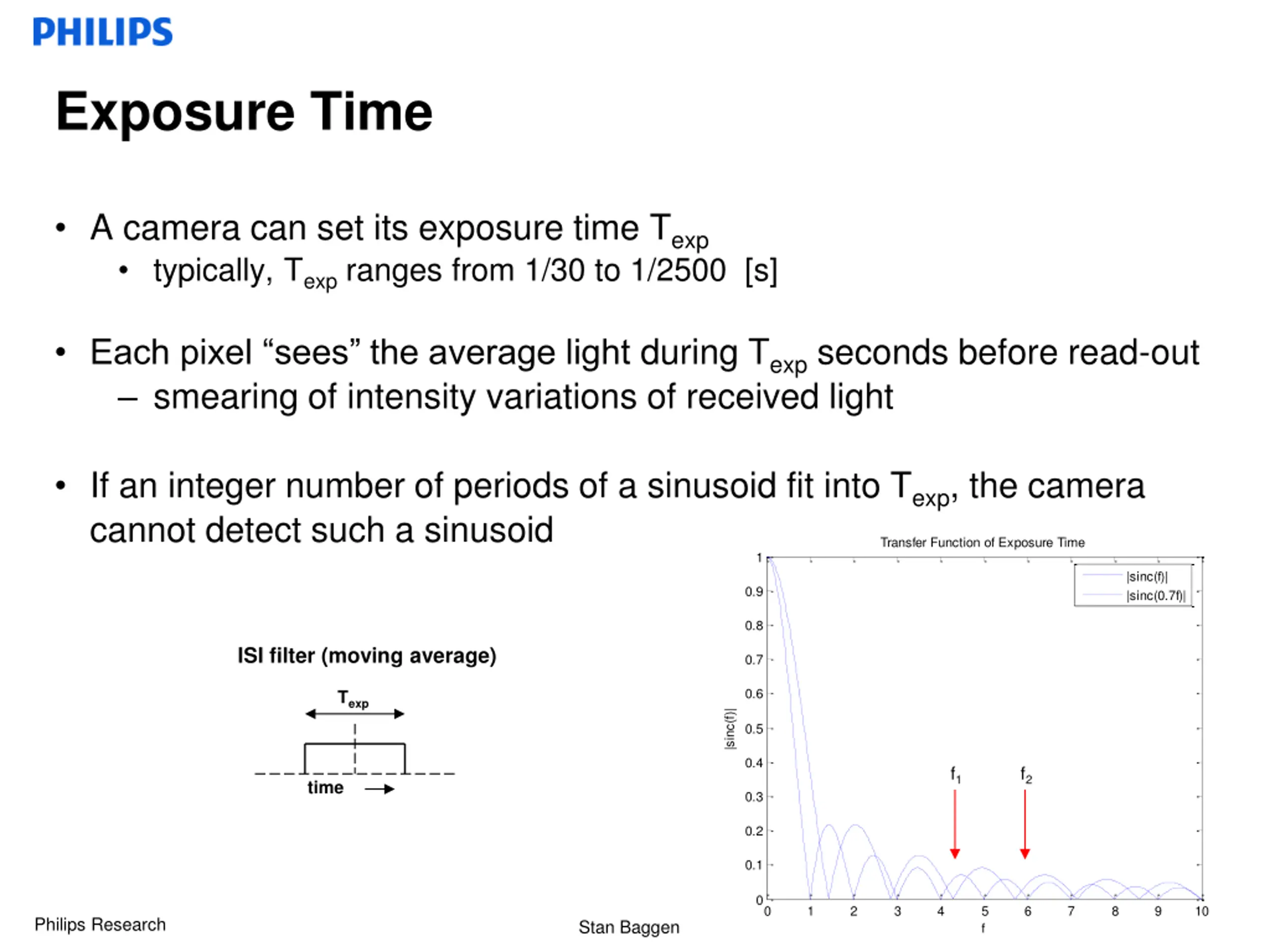 Exposure Time A camera can set its exposure time Texp typically, Texp ranges from 1/30 to 1/2500 [s] Each pixel sees the average light during Texp seconds before read-out smearing of intensity variations of received light If an integer number of periods of a sinusoid fit into Texp, the camera cannot detect such a sinusoid Transfer Function of Exposure Time 1 |sinc(f)| |sinc(0.7f)| 0.9 0.8 ISI filter (moving average) 0.7 0.6 Texp |sinc(f)| 0.5 0.4 f1 f2 time 0.3 0.2 0.1 0 0 1 2 3 4 5 f 6 7 8 9 10 Philips Research Stan Baggen