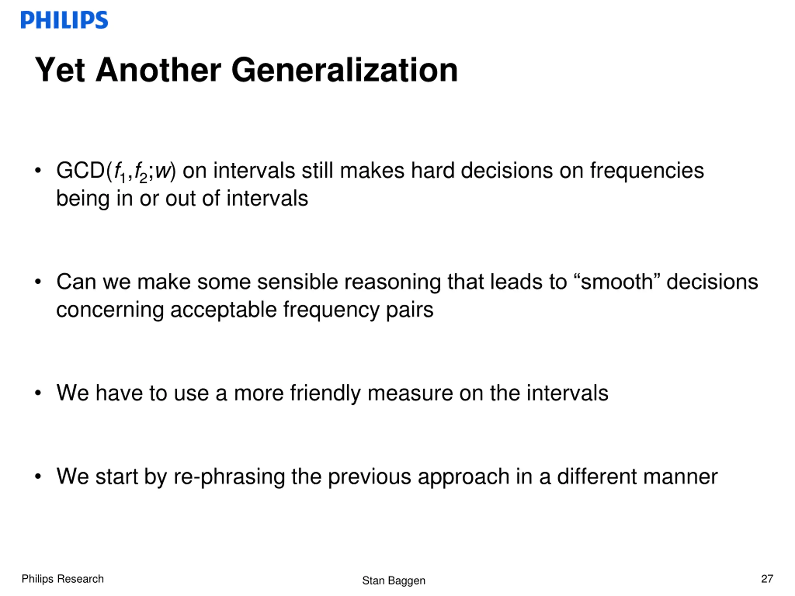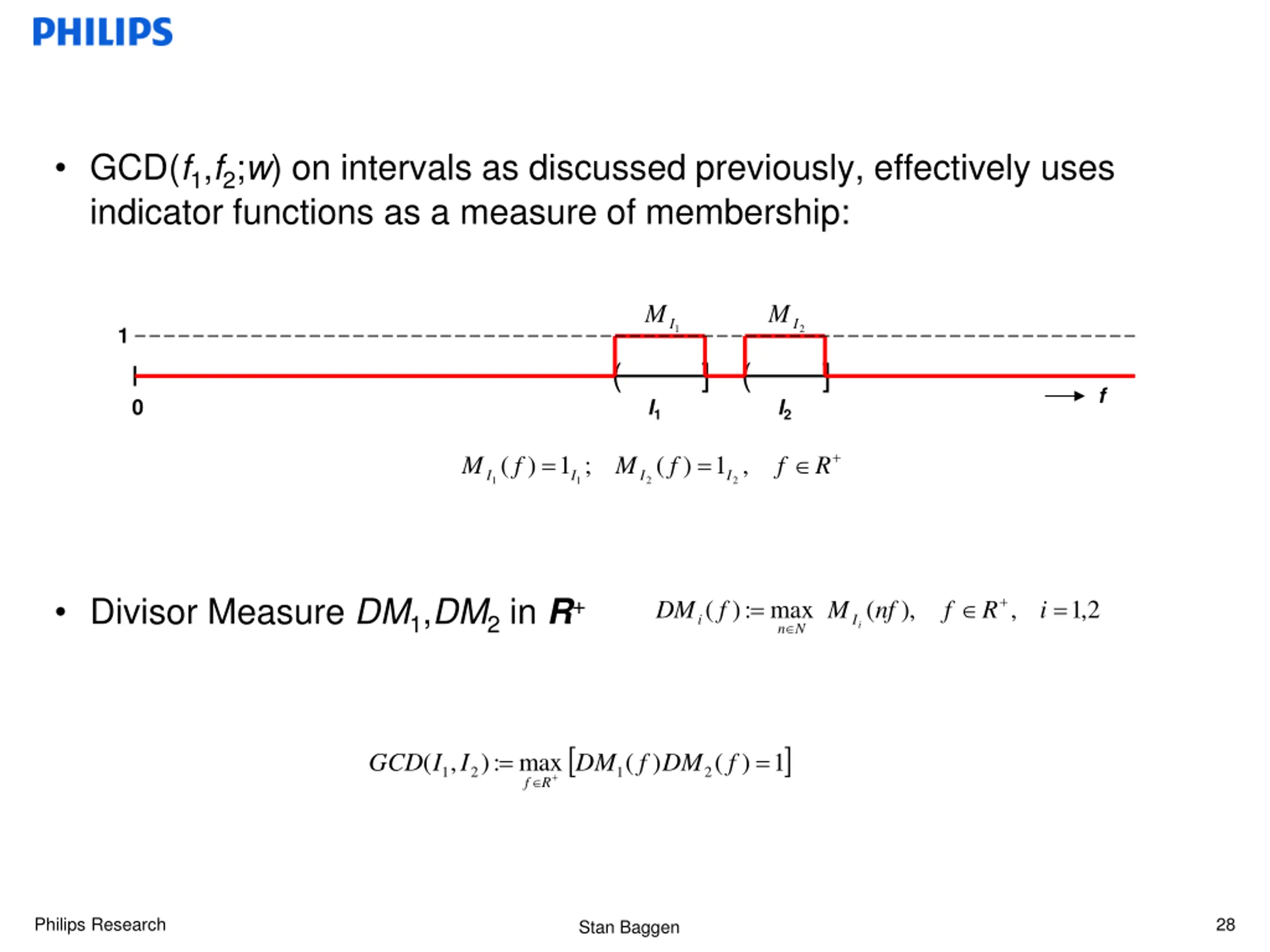 Yet Another Generalization GCD(f1,f2;w) on intervals still makes hard decisions on frequencies being in or out of intervals Can we make some sensible reasoning that leads to smooth decisions concerning acceptable frequency pairs We have to use a more friendly measure on the intervals We start by re-phrasing the previous approach in a different manner Philips Research 27 Stan Baggen