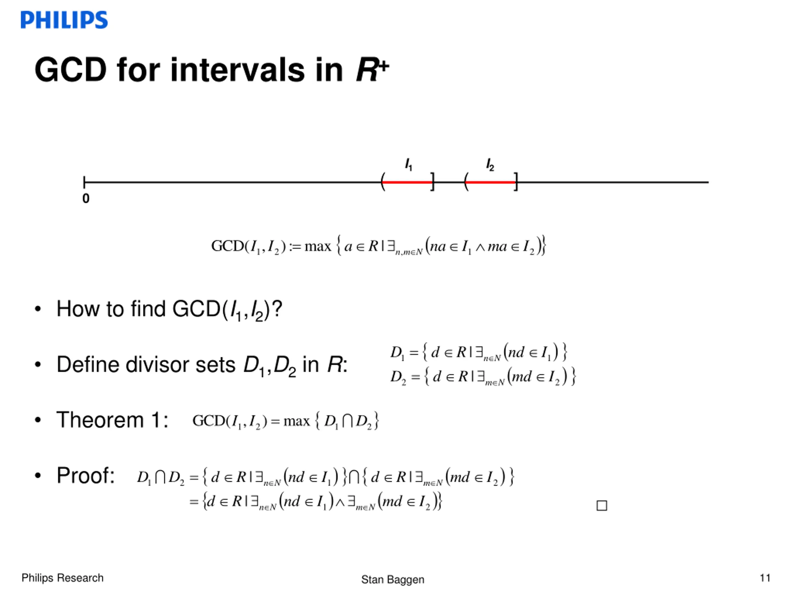 GCD for intervals in R+ I1 I2 ( ] ( ] 0 ( ) = GCD( , : ) max | I I a R na I ma I 1 2 , 1 2 n m N How to find GCD(I1,I2)? ( ) ) = | D d R nd I Define divisor sets D1,D2 in R: 1 1 I n N ( = | D d R md 2 2 m N Theorem 1: = GCD( , ) max I I D D 1 2 1 2 ( nd ) ( ) Proof: = | | D D d R nd I d R md I 1 2 1 2 n N m N ( ) ( ) N = | d R I md I 1 2 n m N Philips Research 11 Stan Baggen