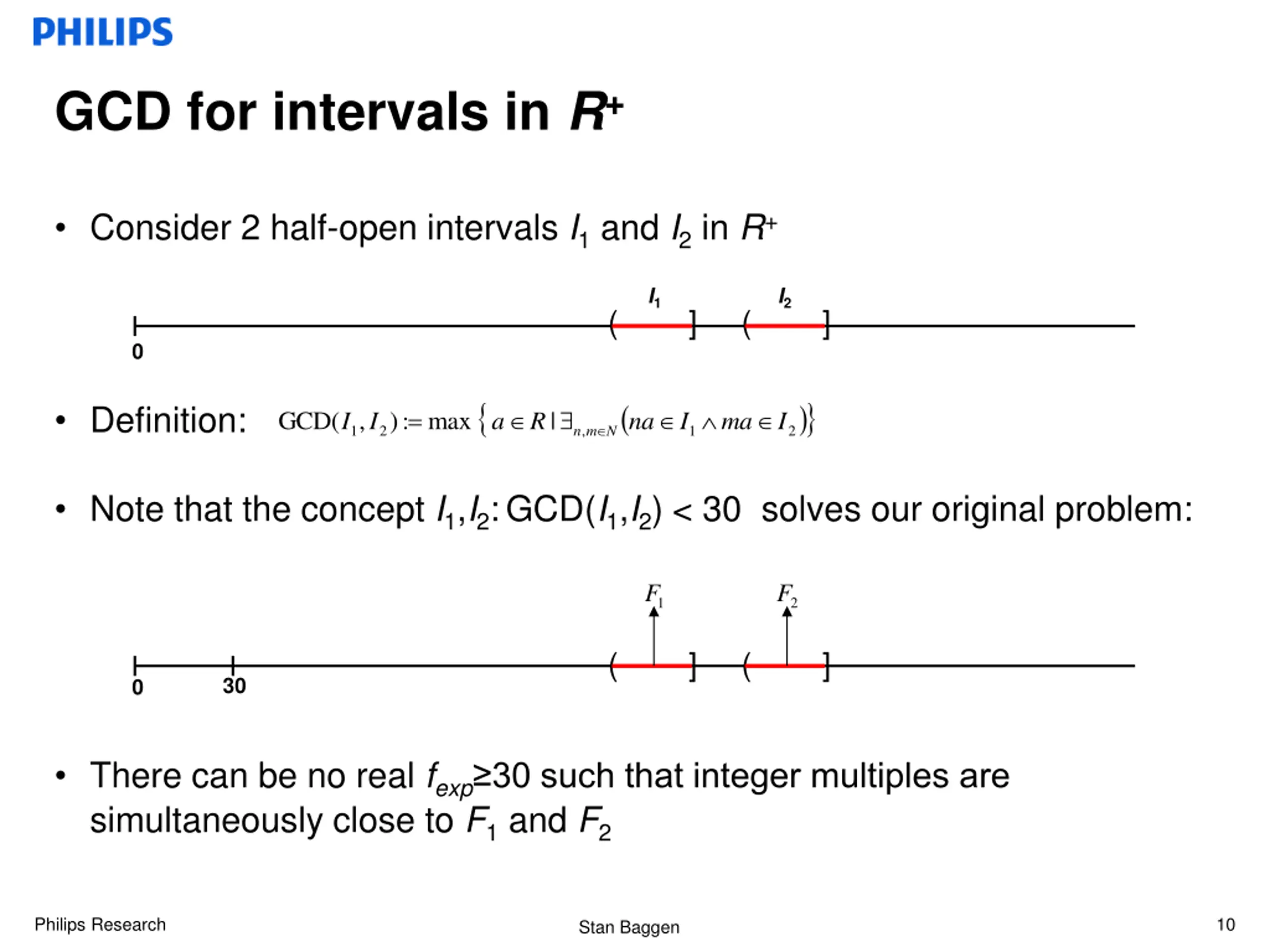 GCD for intervals in R+ Consider 2 half-open intervals I1 and I2 in R+ I1 I2 ( ] ( ] 0 ( ) Definition: = GCD( , : ) max | I I a R na I ma I 1 2 , 1 2 n m N Note that the concept I1,I2:GCD(I1,I2) < 30 solves our original problem: 1 F 2 F ( ] ( ] 30 0 There can be no real fexp 30 such that integer multiples are simultaneously close to F1 and F2 Philips Research 10 Stan Baggen