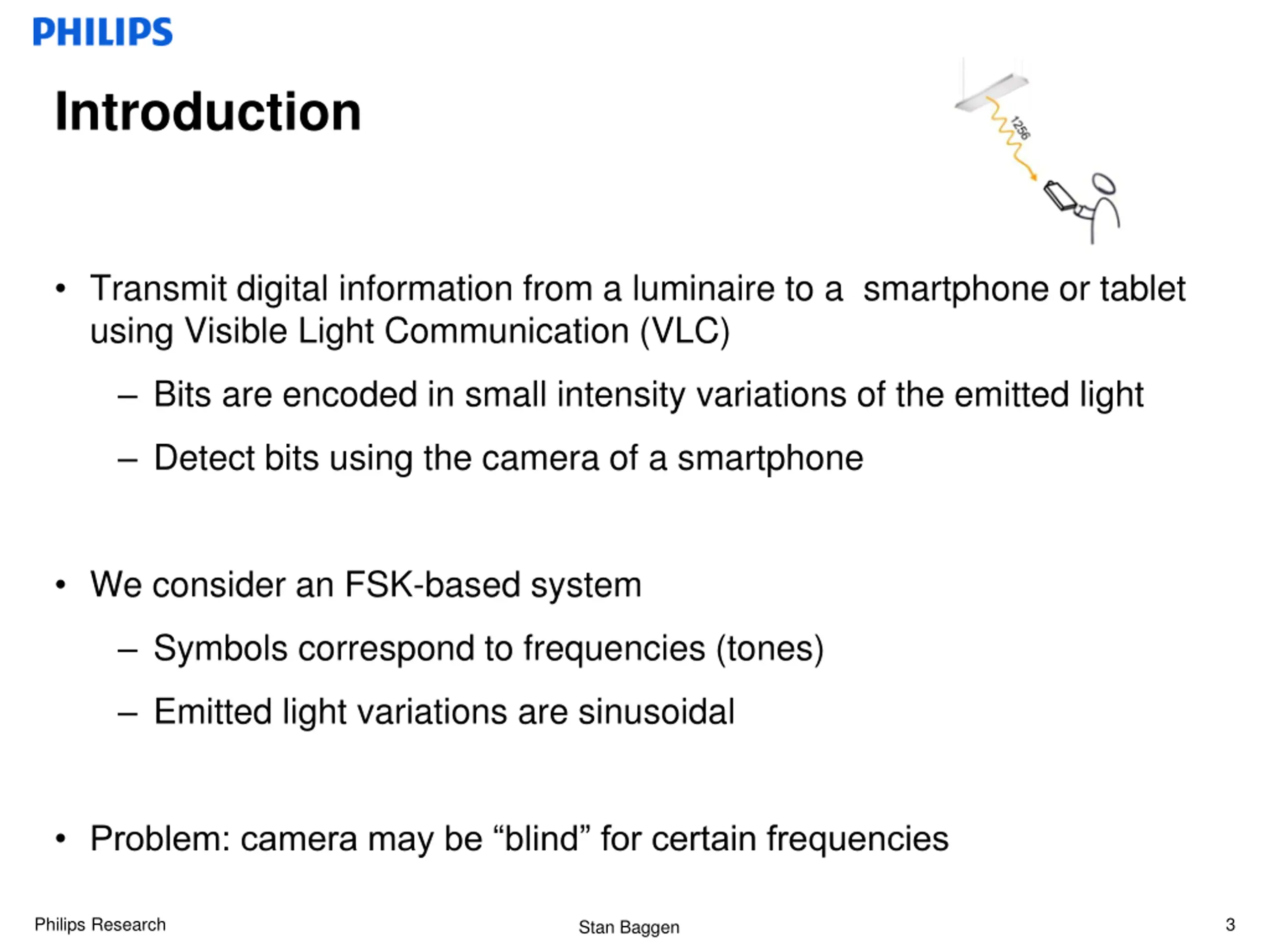 Introduction Transmit digital information from a luminaire to a smartphone or tablet using Visible Light Communication (VLC) Bits are encoded in small intensity variations of the emitted light Detect bits using the camera of a smartphone We consider an FSK-based system Symbols correspond to frequencies (tones) Emitted light variations are sinusoidal Problem: camera may be blind for certain frequencies Philips Research 3 Stan Baggen