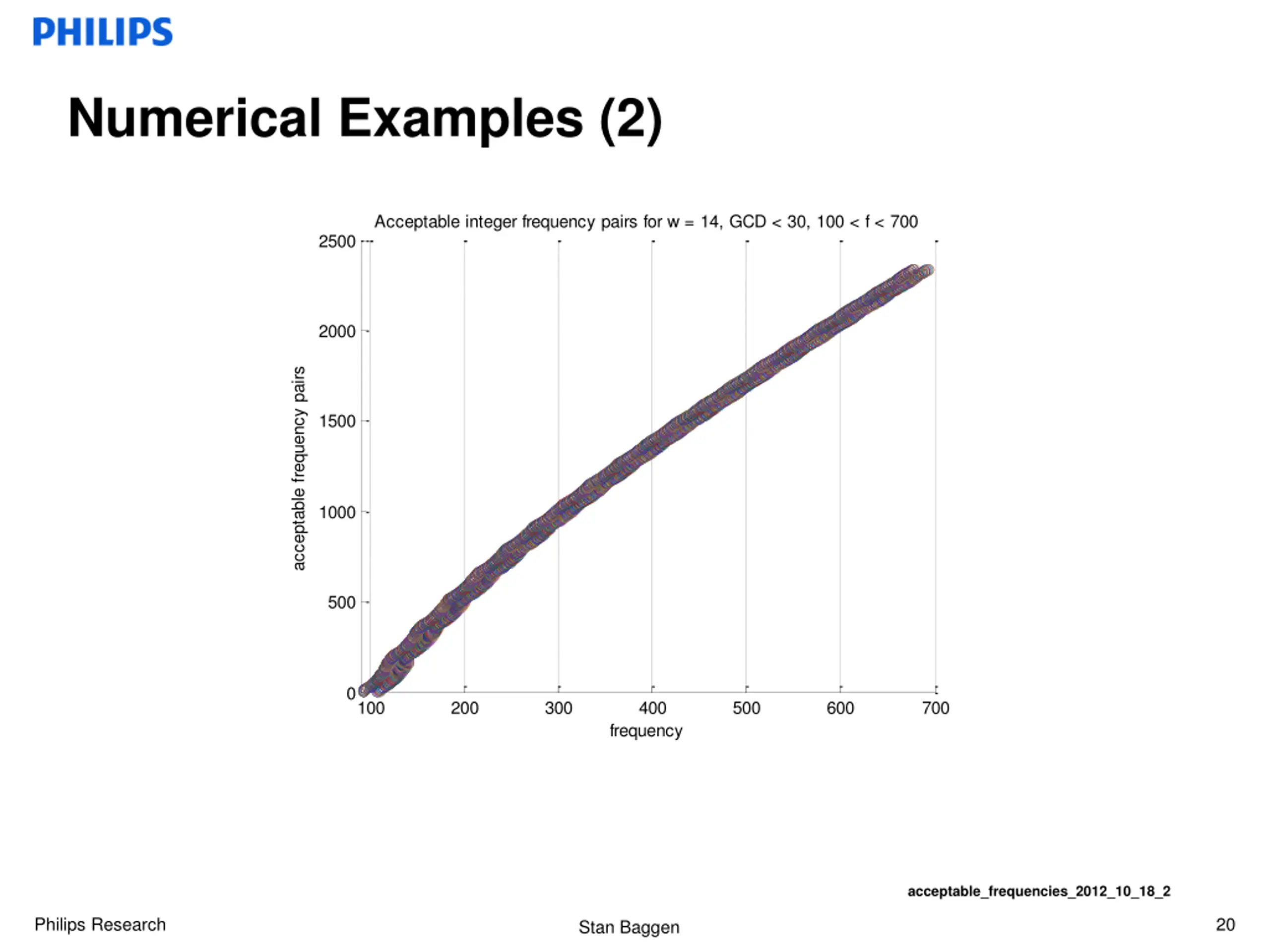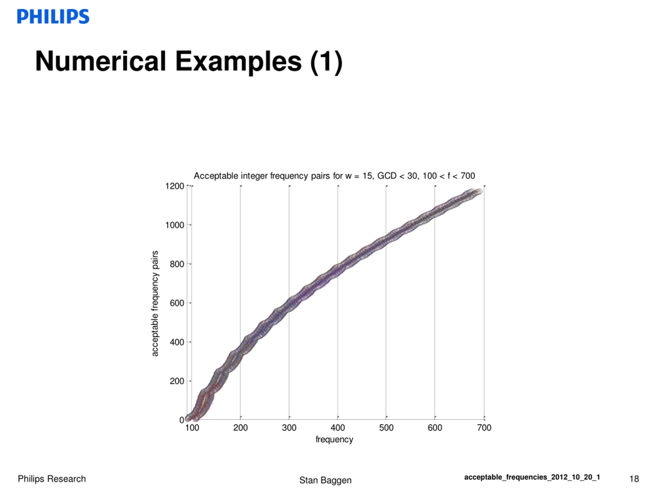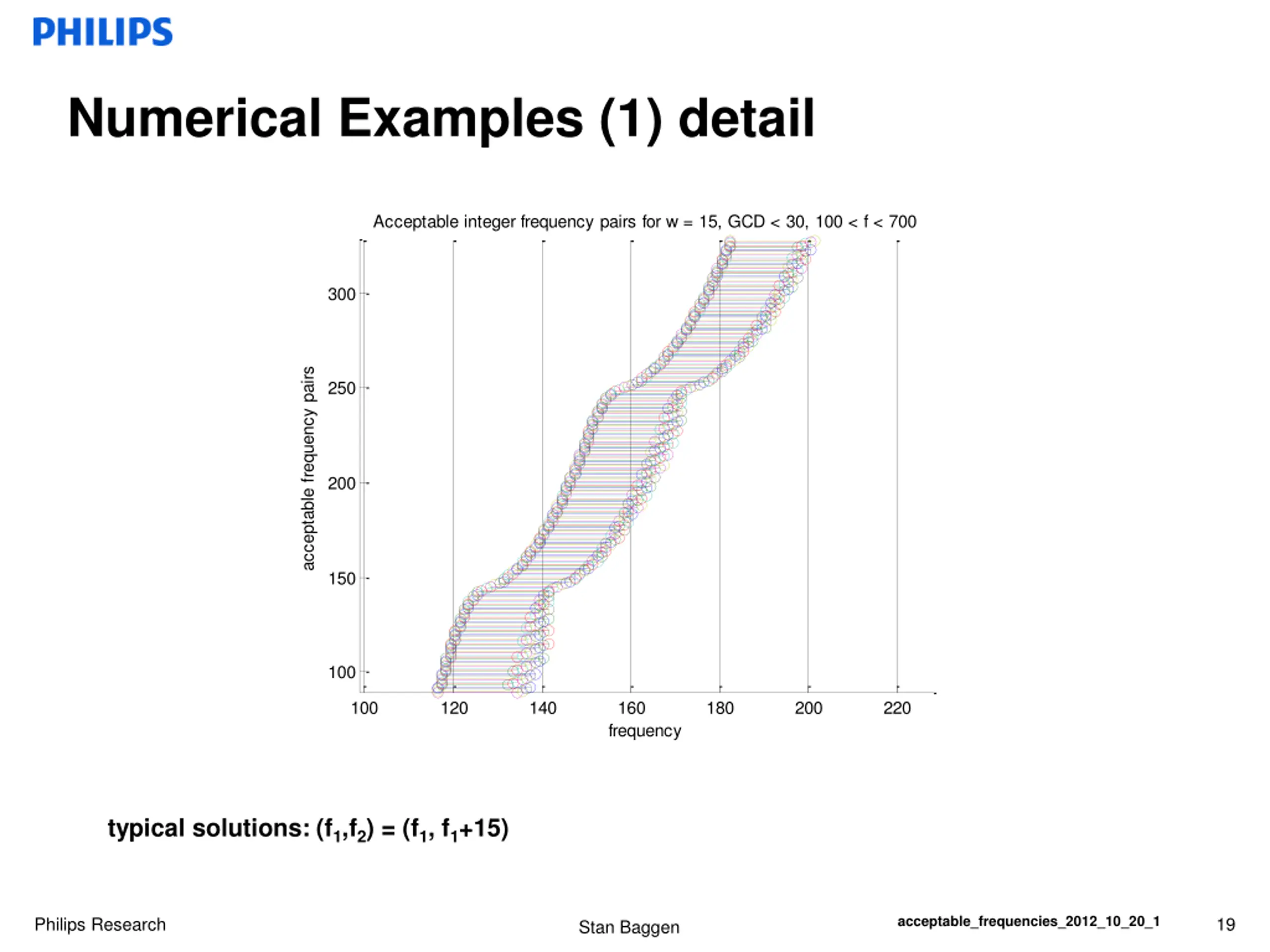 Numerical Examples (1) Acceptable integer frequency pairs for w = 15, GCD < 30, 100 < f < 700 1200 1000 acceptable frequency pairs 800 600 400 200 0 100 200 300 400 500 600 700 frequency acceptable_frequencies_2012_10_20_1 Philips Research 18 Stan Baggen