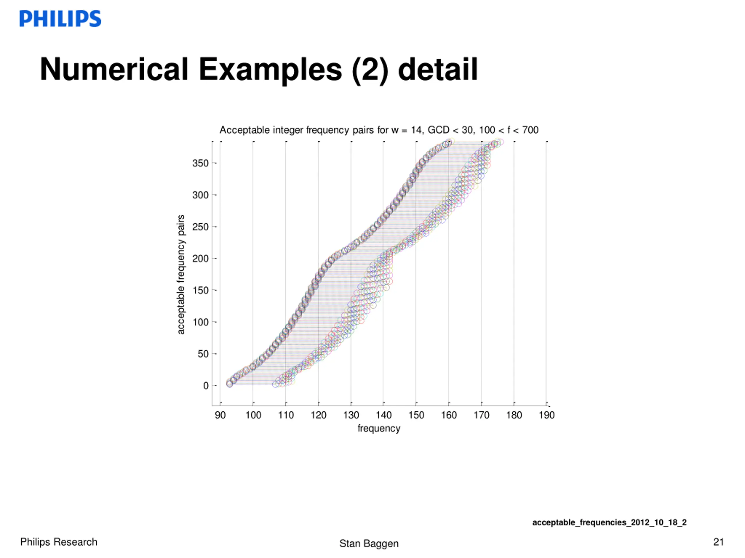 Numerical Examples (2) Acceptable integer frequency pairs for w = 14, GCD < 30, 100 < f < 700 2500 2000 acceptable frequency pairs 1500 1000 500 0 100 200 300 400 500 600 700 frequency acceptable_frequencies_2012_10_18_2 Philips Research 20 Stan Baggen