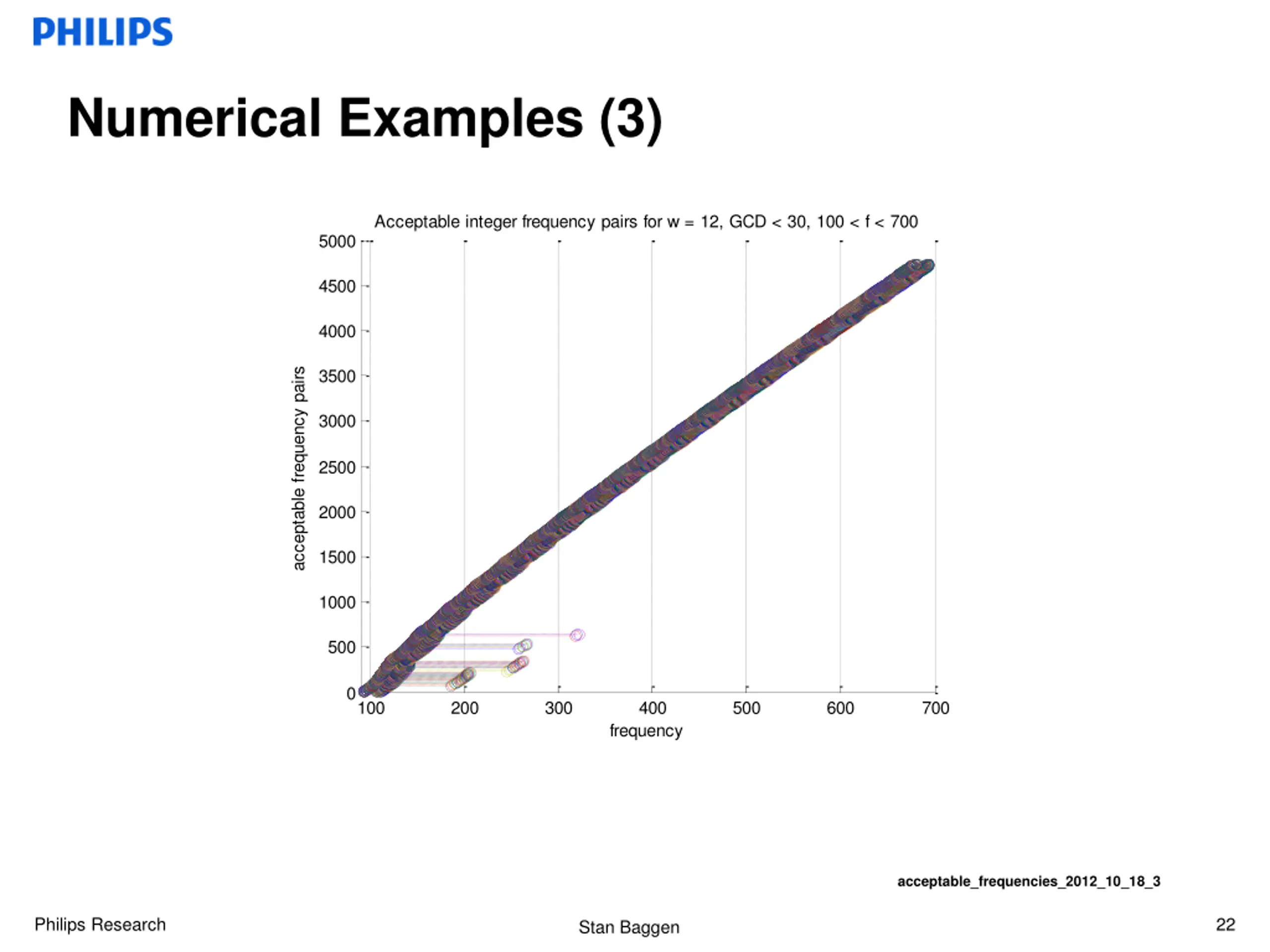 Numerical Examples (2) detail Acceptable integer frequency pairs for w = 14, GCD < 30, 100 < f < 700 350 300 acceptable frequency pairs 250 200 150 100 50 0 90 100 110 120 130 140 150 160 170 180 190 frequency acceptable_frequencies_2012_10_18_2 Philips Research 21 Stan Baggen
