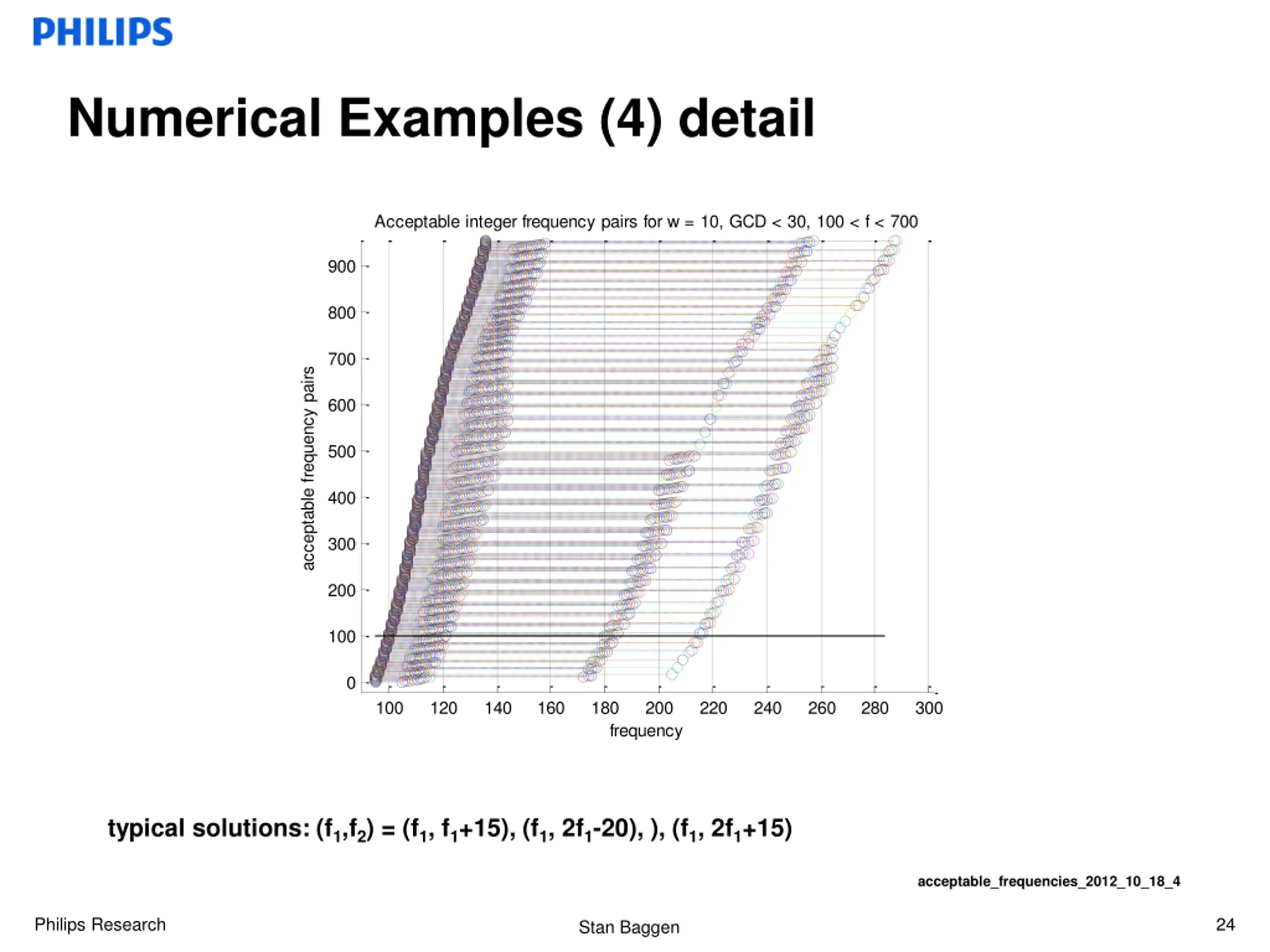 Numerical Examples (4) Acceptable integer frequency pairs for w = 10, GCD < 30, 100 < f < 700 9000 8000 7000 acceptable frequency pairs 6000 5000 4000 3000 2000 1000 0 100 200 300 400 500 600 700 frequency acceptable_frequencies_2012_10_18_4 Philips Research 23 Stan Baggen