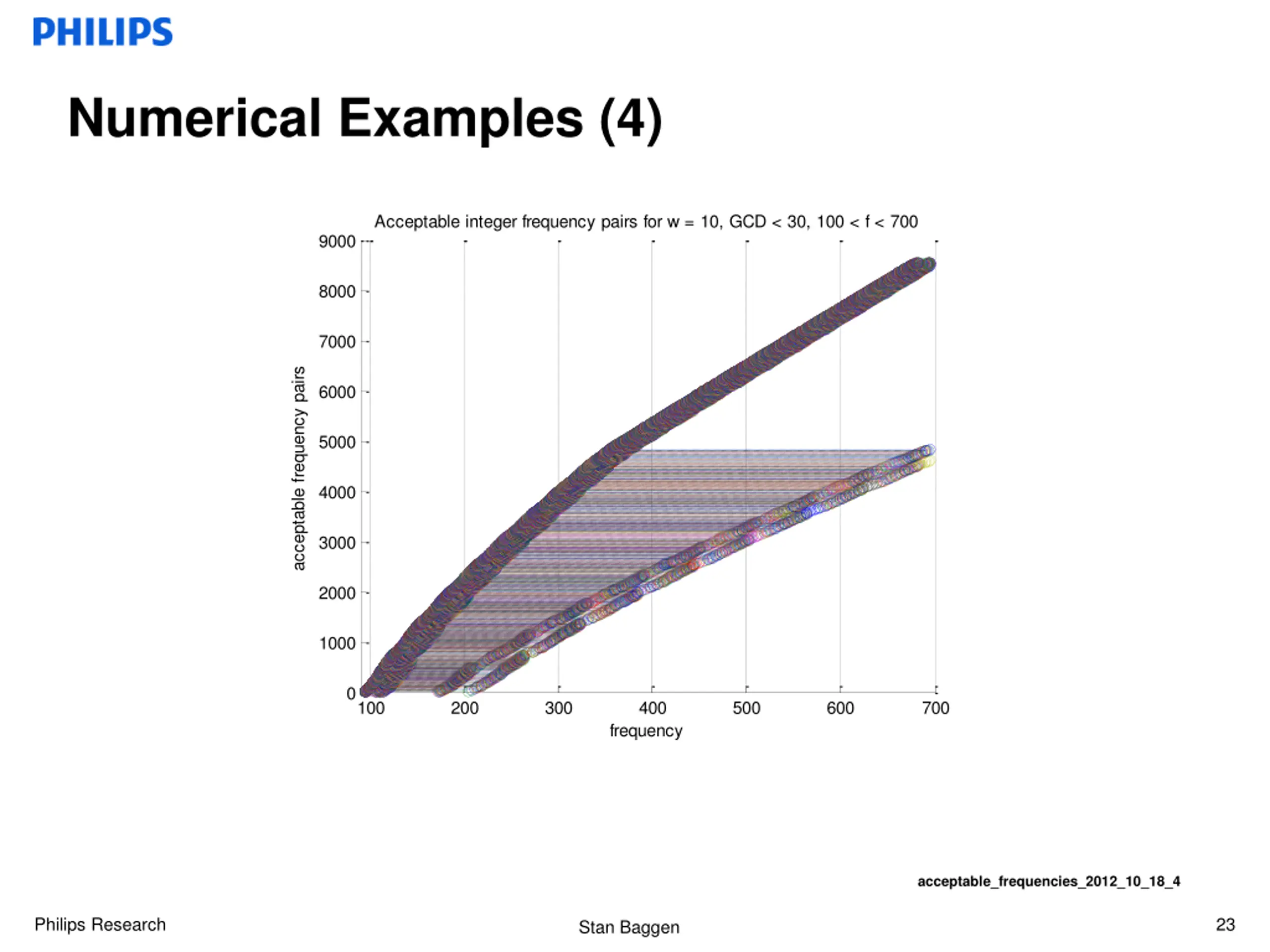 Numerical Examples (3) Acceptable integer frequency pairs for w = 12, GCD < 30, 100 < f < 700 5000 4500 4000 3500 acceptable frequency pairs 3000 2500 2000 1500 1000 500 0 100 200 300 400 500 600 700 frequency acceptable_frequencies_2012_10_18_3 Philips Research 22 Stan Baggen