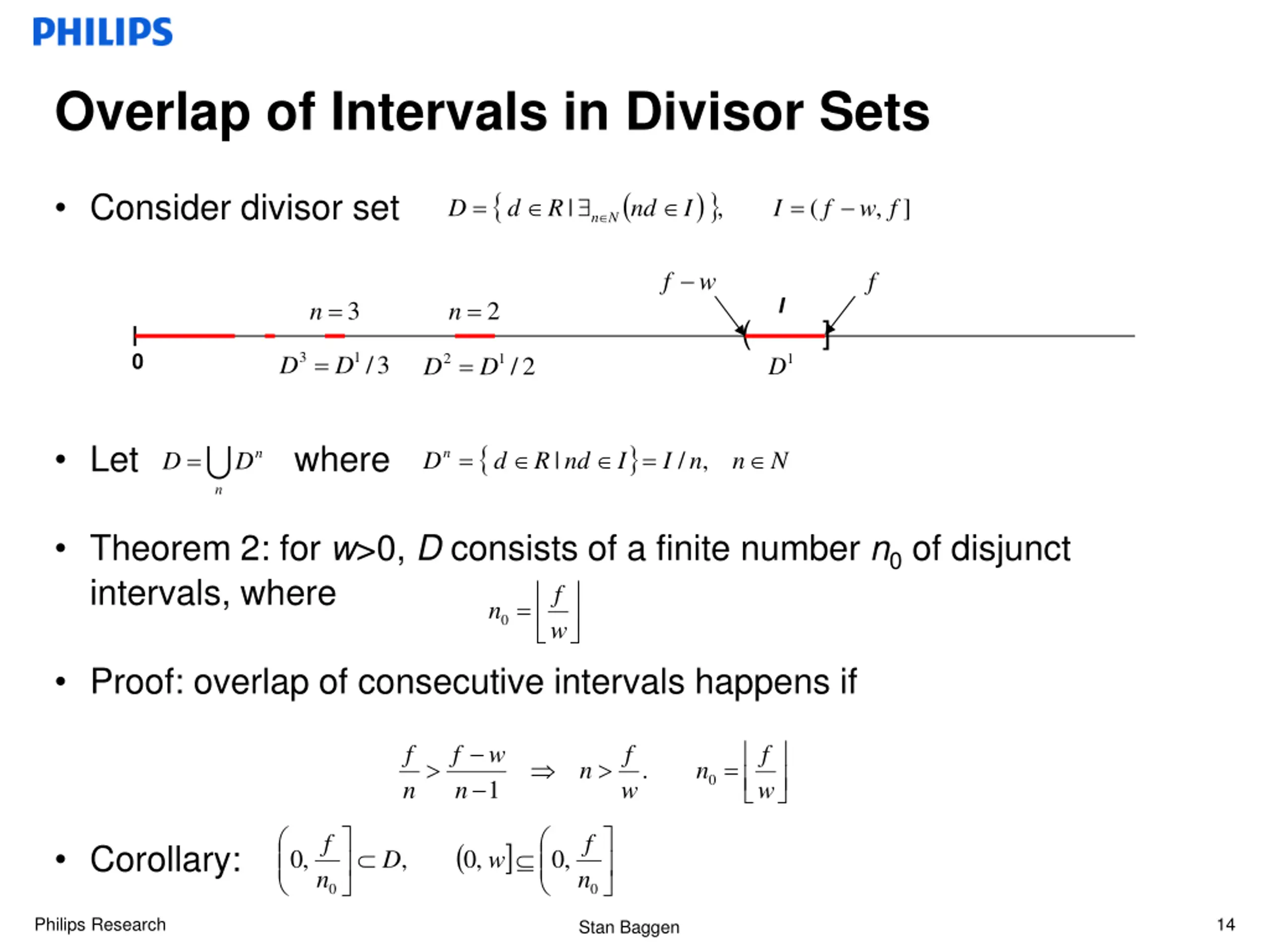Overlap of Intervals in Divisor Sets ( ) Consider divisor set = = | , ( , ] D d R nd I I f w f n N f w f I = = 3 2 n n ( ] D D = 3 1 0 D = 2 1 1 / 3 D / 2 D Let where n = = D = Dn n | / , d R nd I I n n N D Theorem 2: for w>0, D consists of a finite number n0 of disjunct intervals, where w f = n0 Proof: overlap of consecutive intervals happens if f f w 1 f f = . n n 0 n n w w f f ( , 0 Corollary: , 0 , , 0 D w n n 0 0 Philips Research 14 Stan Baggen