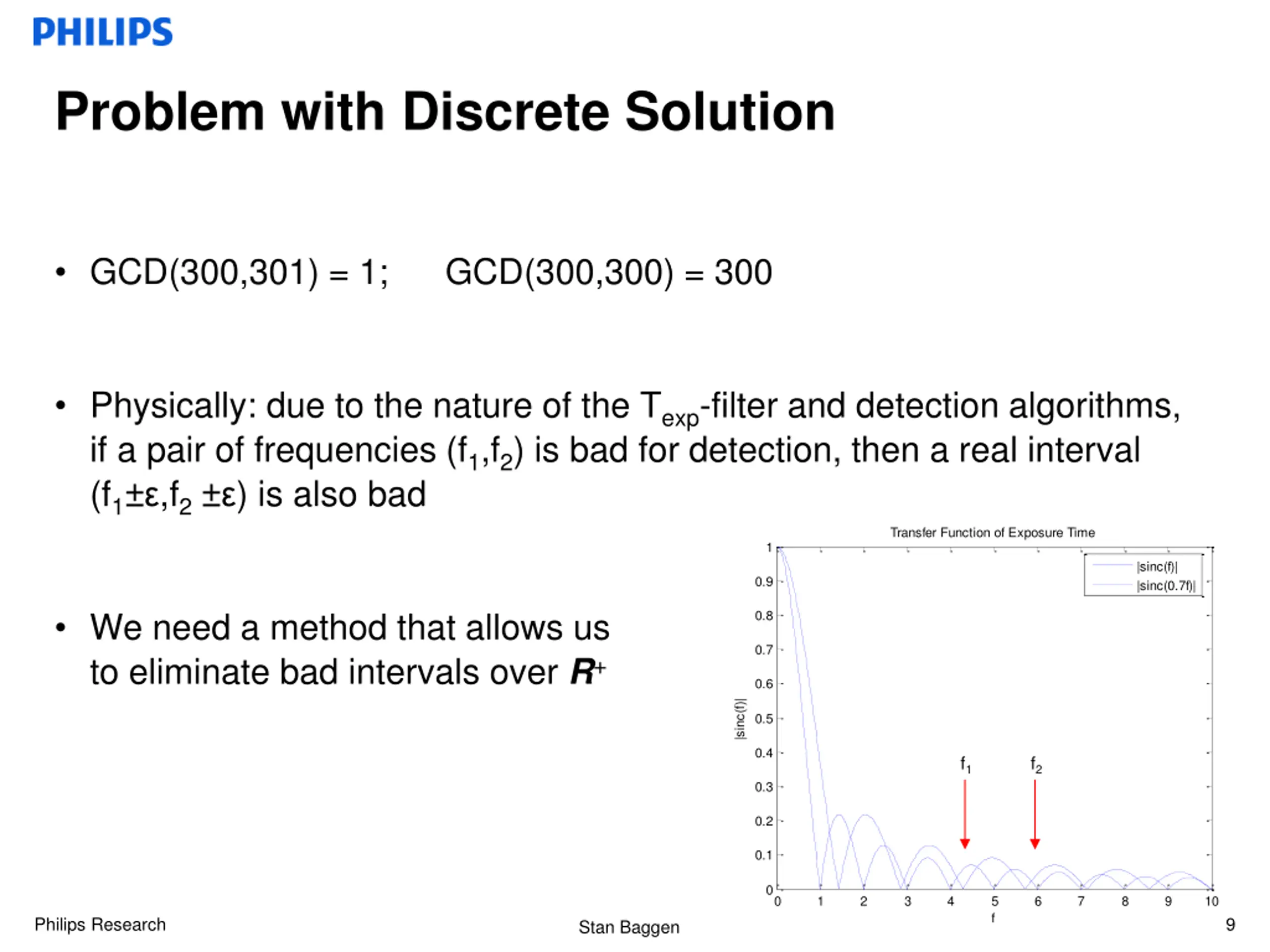 Discrete Solution: Example f1 = 290; f2 = 319 Largest integer that divides both f1 and f2 equals GCD(f1,f2) = 29 No integer fexp 30 exists for which multiples are simultaneously equal to f1 andf2 Philips Research 8 Stan Baggen