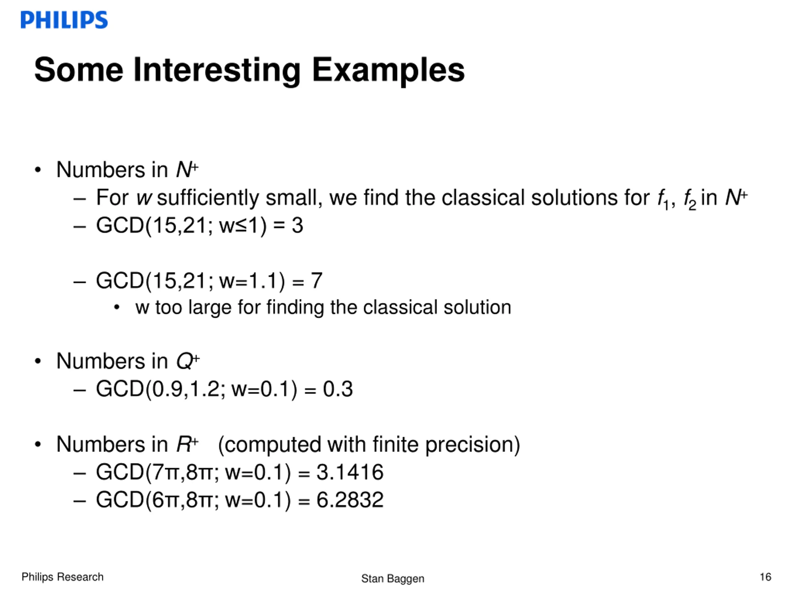Some Interesting Examples Numbers in N+ For w sufficiently small, we find the classical solutions for f1, f2 in N+ GCD(15,21; w 1) = 3 GCD(15,21; w=1.1) = 7 w too large for finding the classical solution Numbers in Q+ GCD(0.9,1.2; w=0.1) = 0.3 Numbers in R+ (computed with finite precision) GCD(7 ,8 ; w=0.1) = 3.1416 GCD(6 ,8 ; w=0.1) = 6.2832 Philips Research 16 Stan Baggen