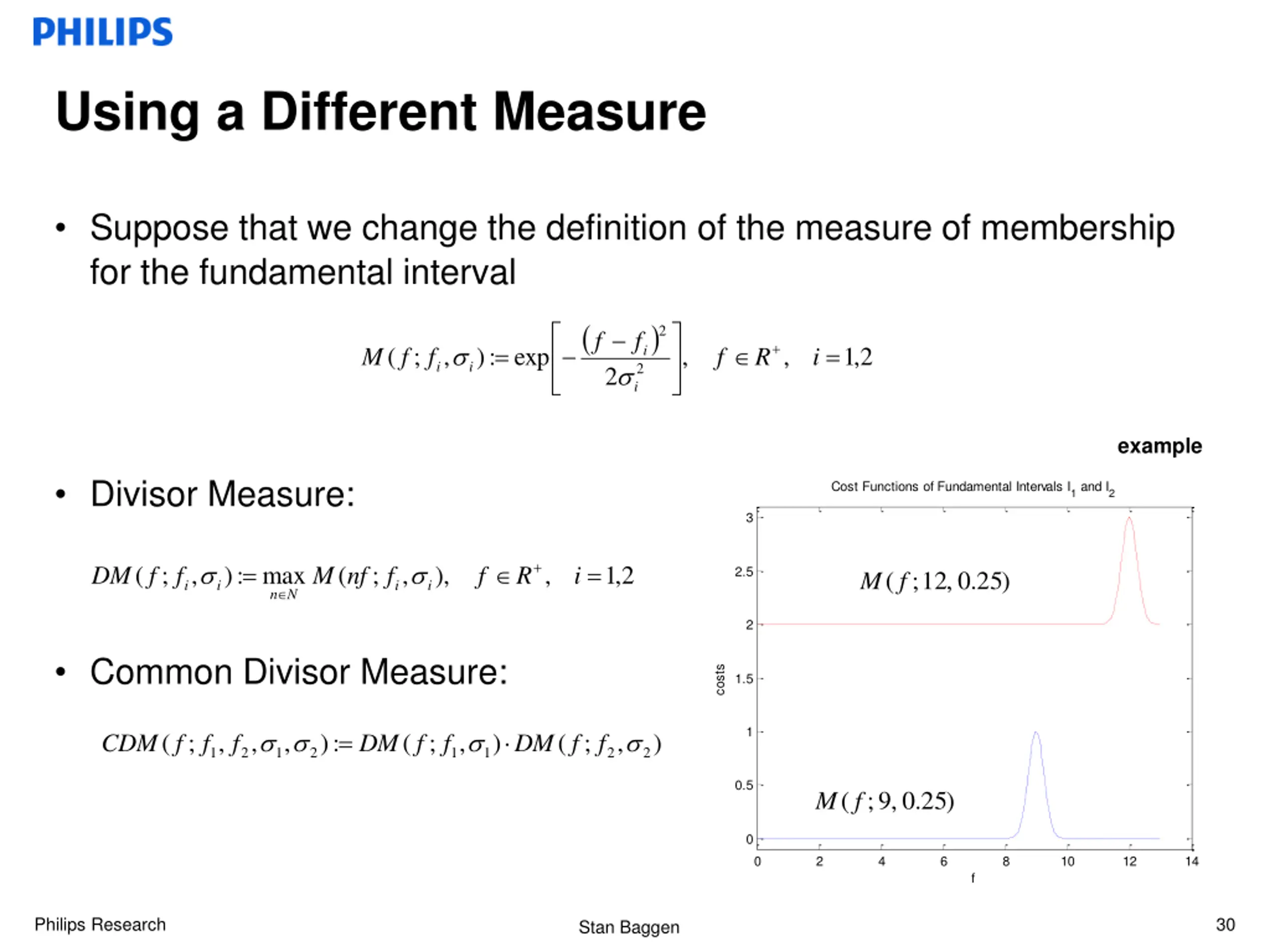 Using a Different Measure Suppose that we change the definition of the measure of membership for the fundamental interval ( ) 2 f f + = 2 , 1 = ( ; , : ) i exp , , i M f f f R i i 2 i 2 example Divisor Measure: Cost Functions of Fundamental Intervals I1 and I2 3 + = 2 , 1 = ( ; , : ) i max n ( ; , ), , DM f f M nf f f R i 2.5 ( f ; 12 . 0 , 25 ) M i i i N 2 Common Divisor Measure: costs 1.5 1 = ( ; , , , : ) 2 ( ; , ) ( ; , ) CDM f f f DM f f DM f f 1 2 1 1 1 2 2 0.5 ( f , 9 ; . 0 25 ) M 0 0 2 4 6 8 10 12 14 f Philips Research 30 Stan Baggen
